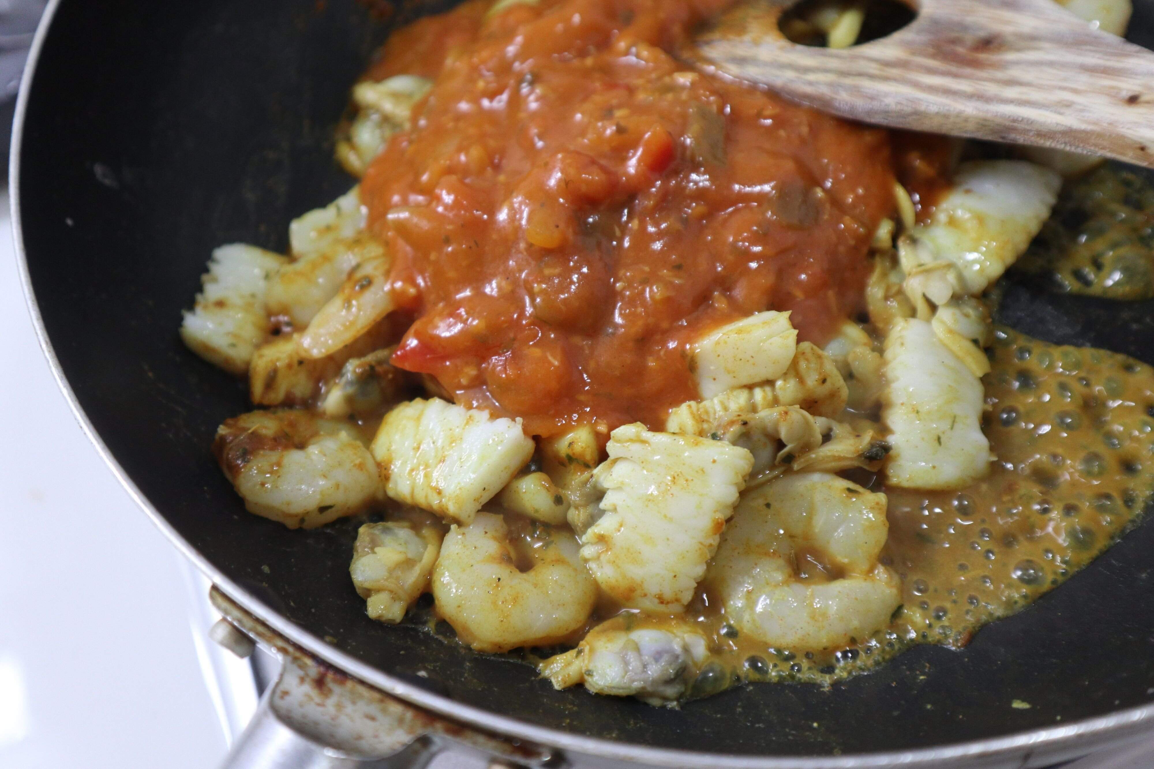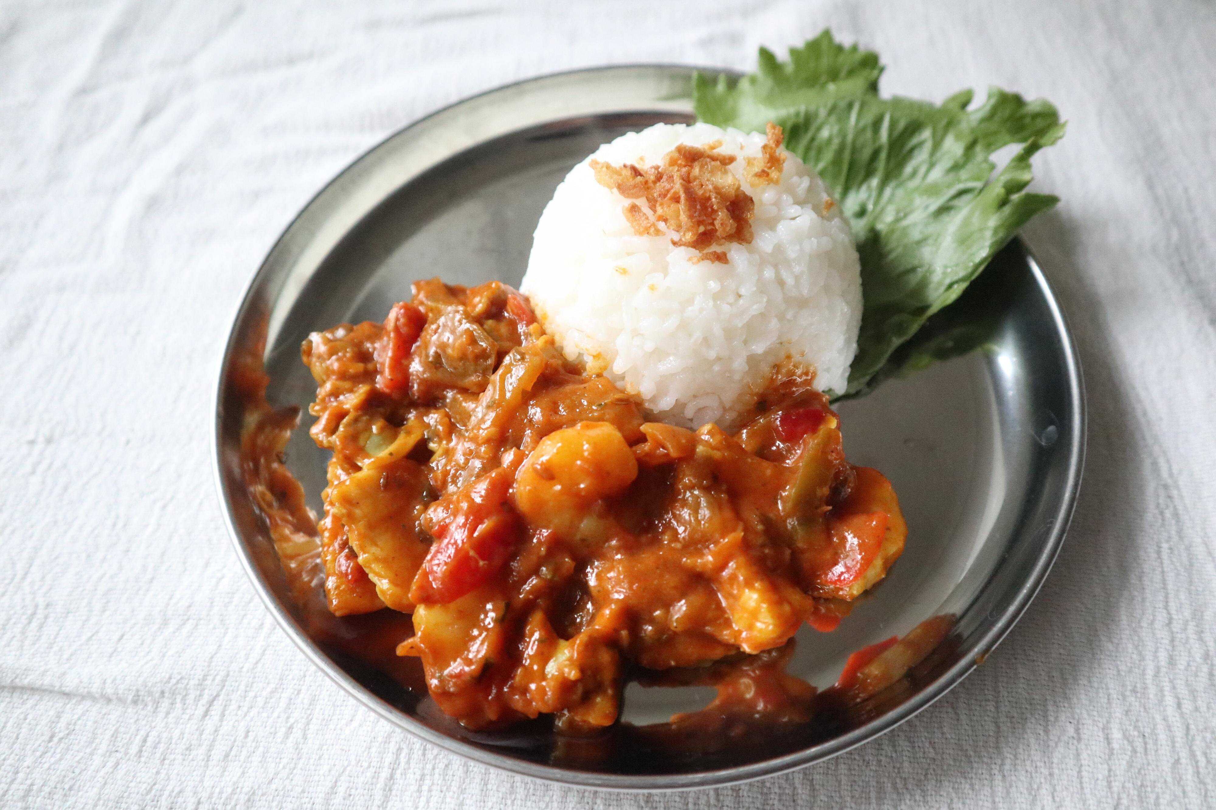 ソースには、トマト、ピーマン、玉ねぎ、ココナッツミルクなどが入っています。