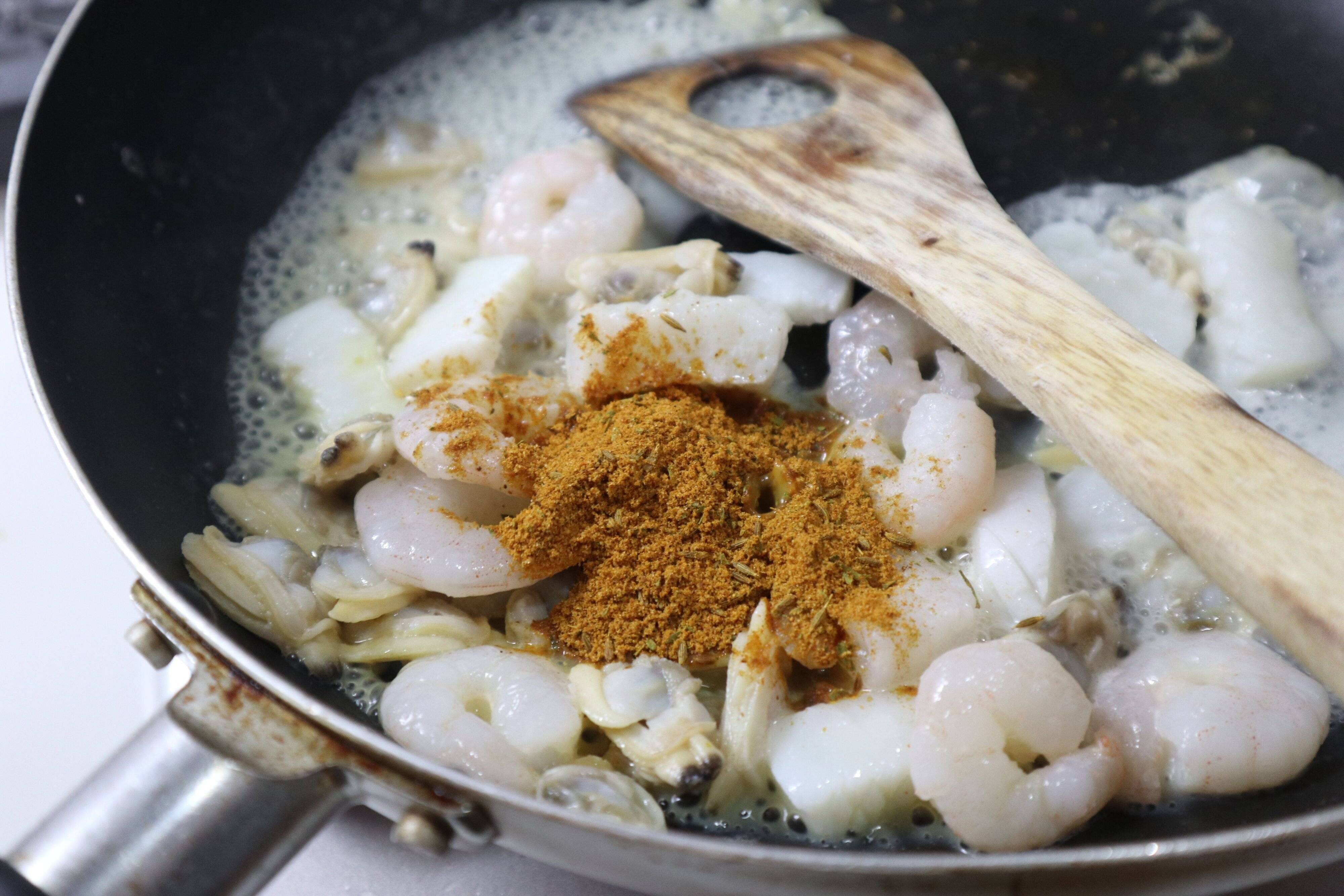 フライパンを中火にかけて、バターを加えてシーフードミックスを加えて軽く炒めて、スパイスを加え香りが出るまで炒める。