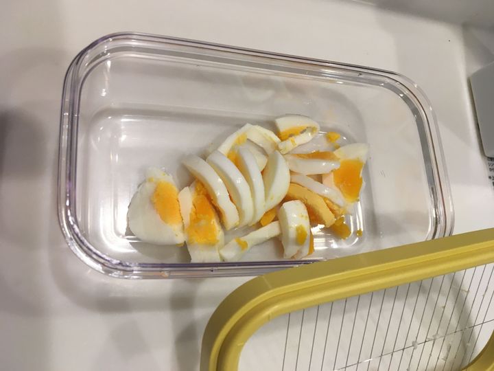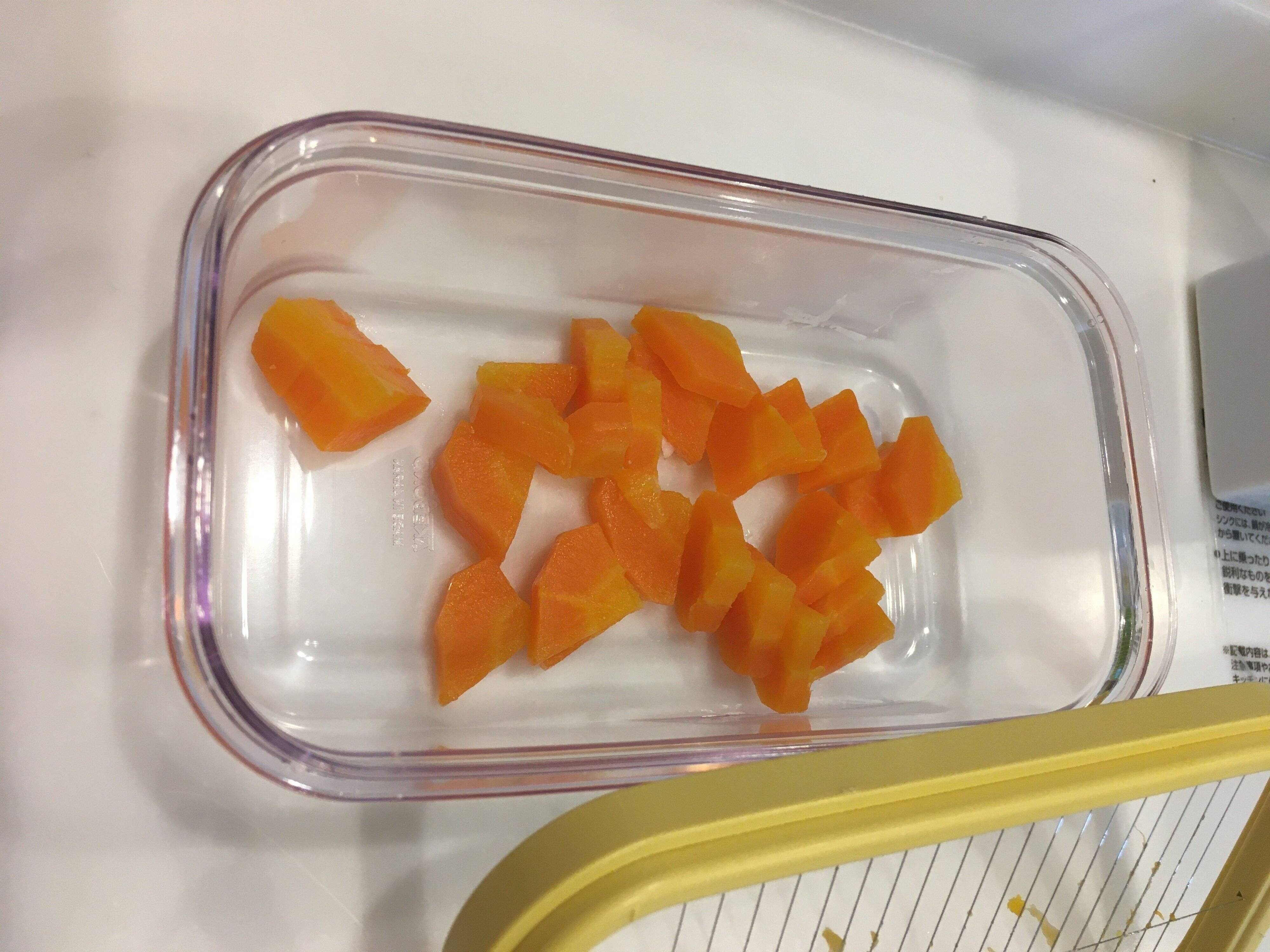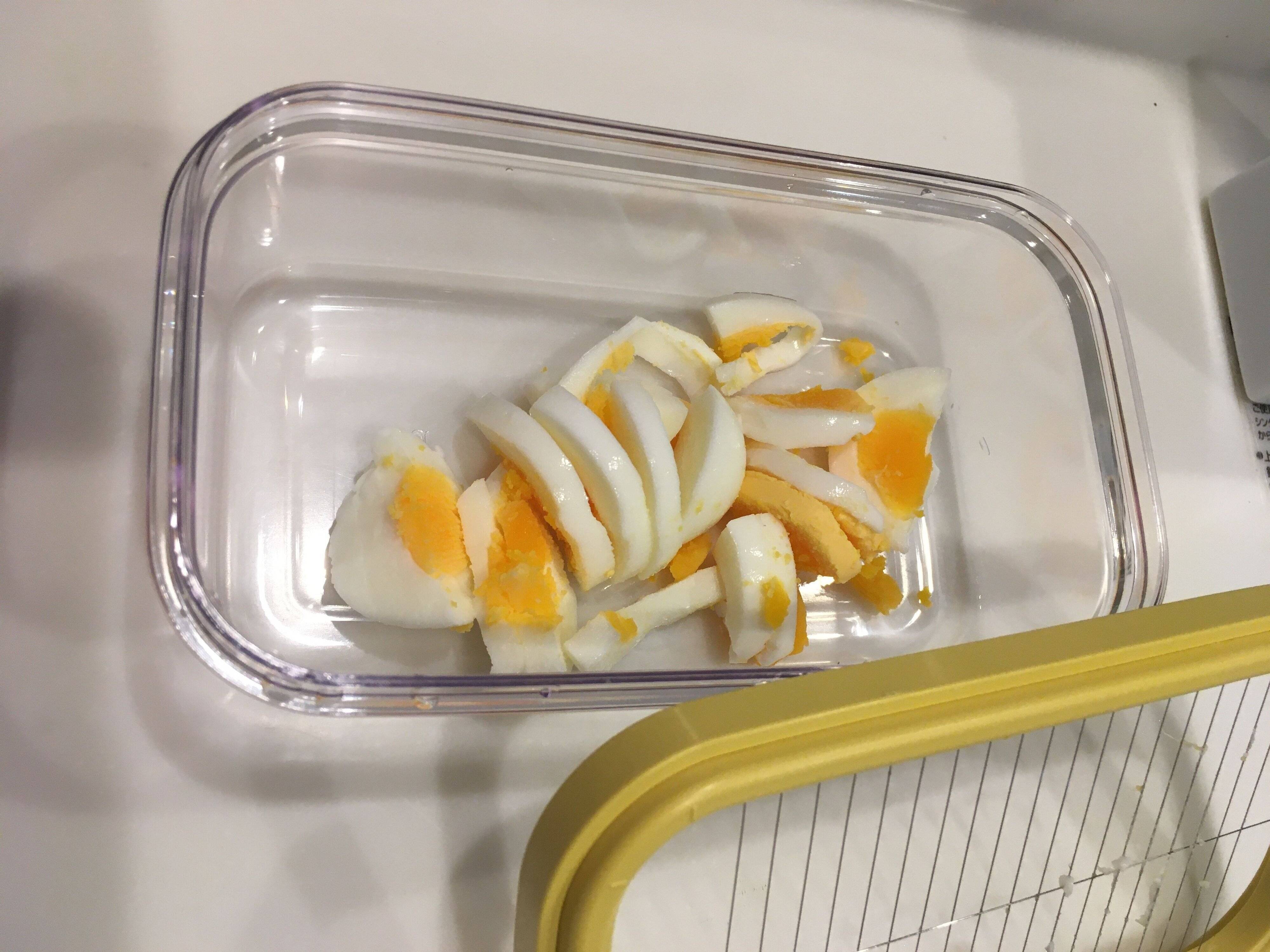 フルーツ以外にも、柔らかいものであれば大体利用することができそう。たとえばゆでたまご。黄身の部分が通るか心配ですが、写真のとおりキレイかつ均一にカットできました。また、ゆでたニンジンも気持ちよく切れました!