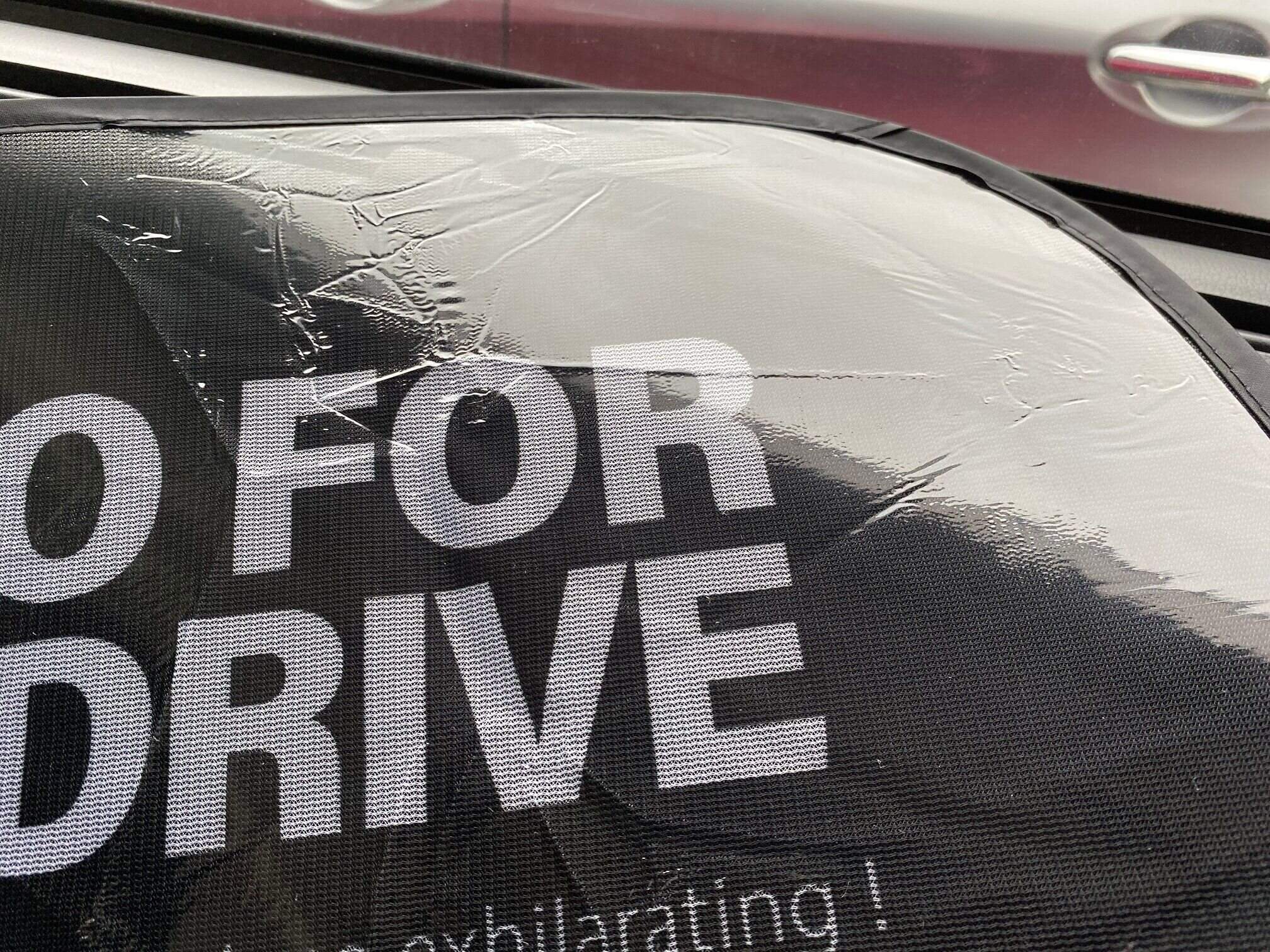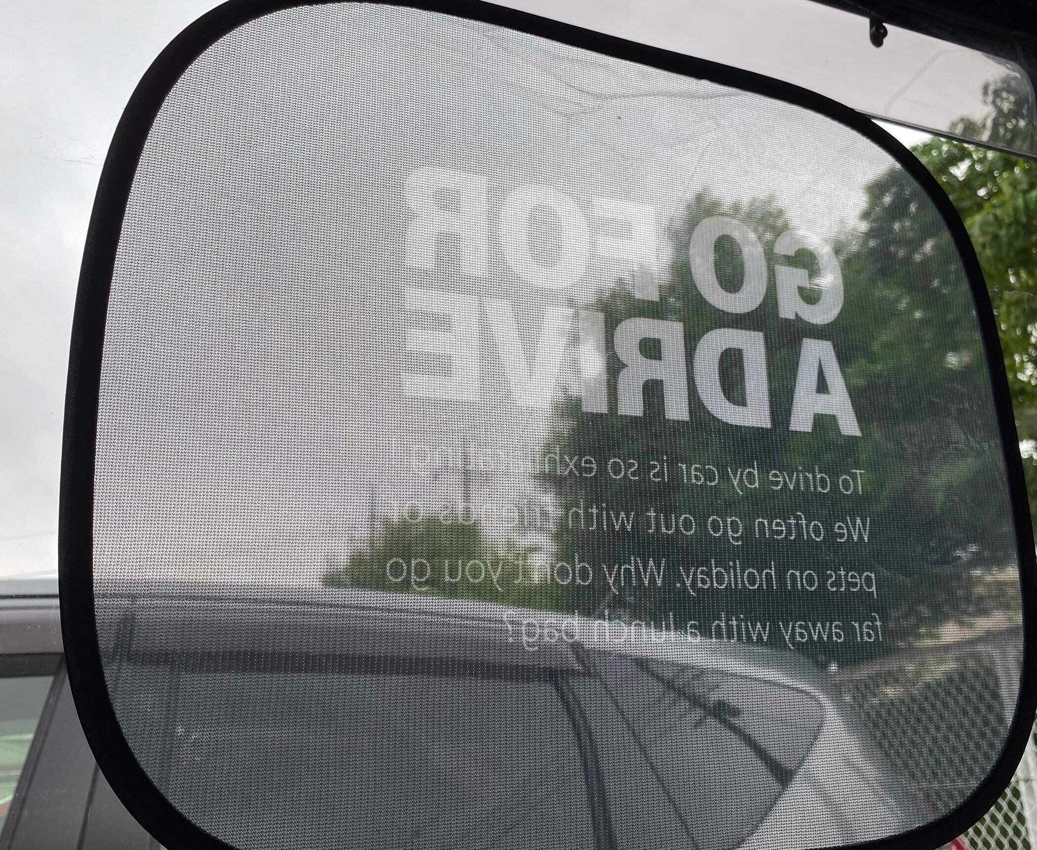 吸盤不要の「サンシェード」は価格300円。 サイズは36×43cmで、一般的な車の窓に使えます。ビニール素材の部分をペタッと窓に貼りつけるだけです。手で空気が入らないようにするだけできれいに装着できます。