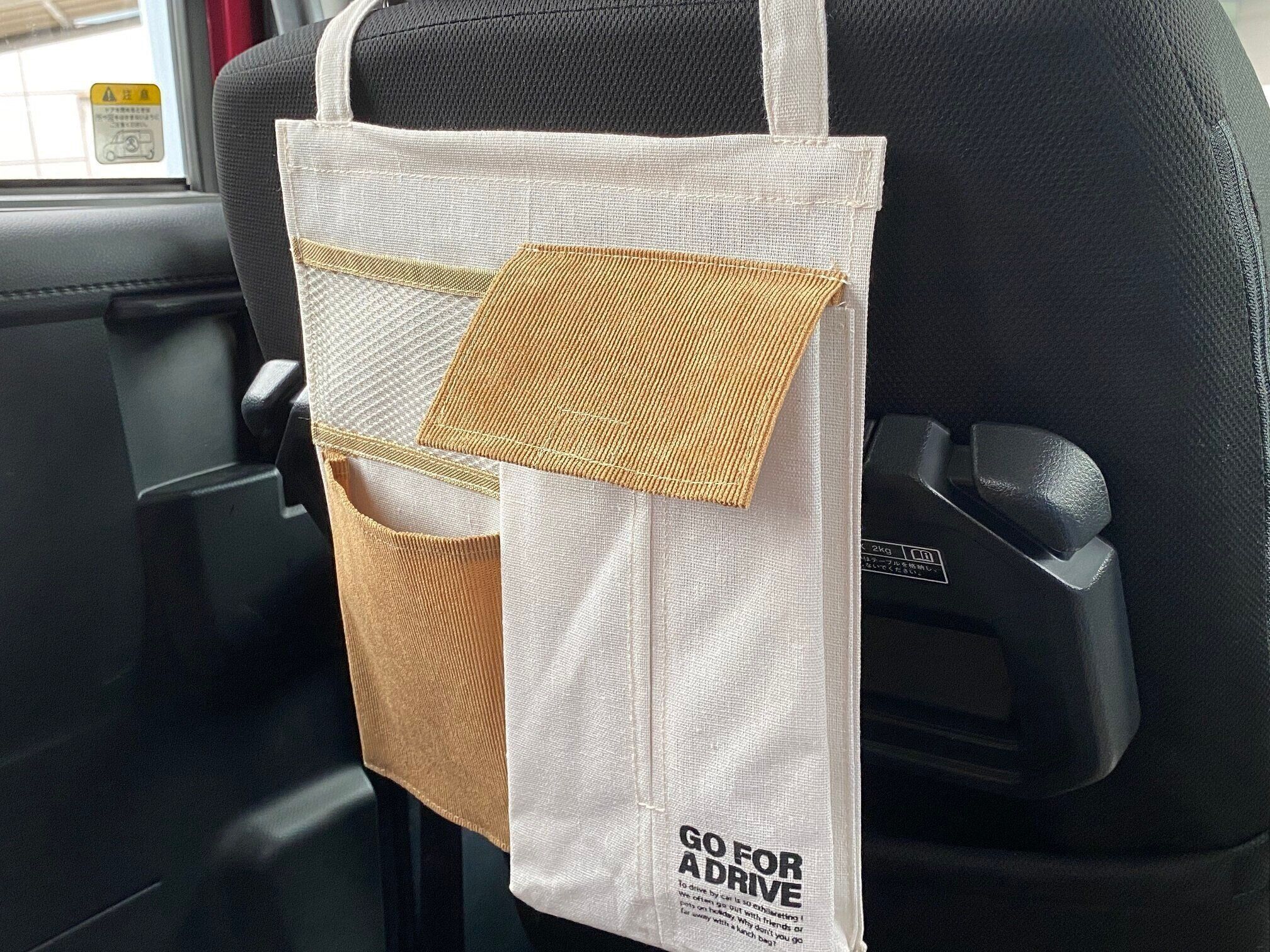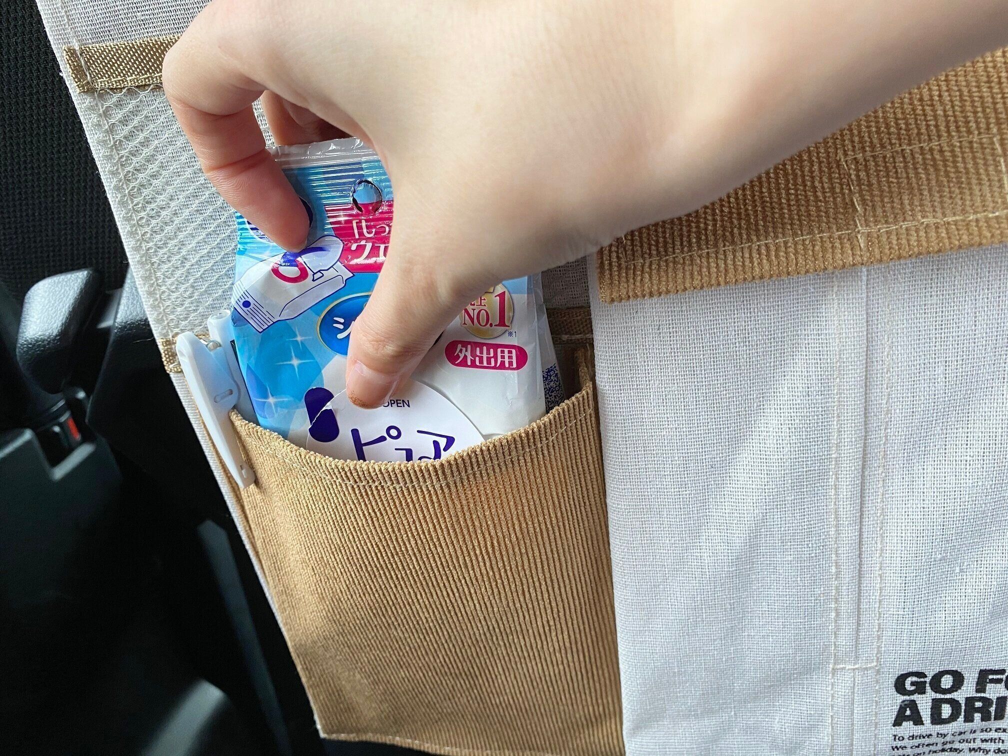 小さい子どもがいるかたは、車内にいろいろな小物を持ち込みますよね。そして車内で過ごすうちに、それらの小物はバラバラと散らかってしまいがち……そんな悩みを解決してくれるのが、こちらの「シートバッグポケット」です。価格は300円。
