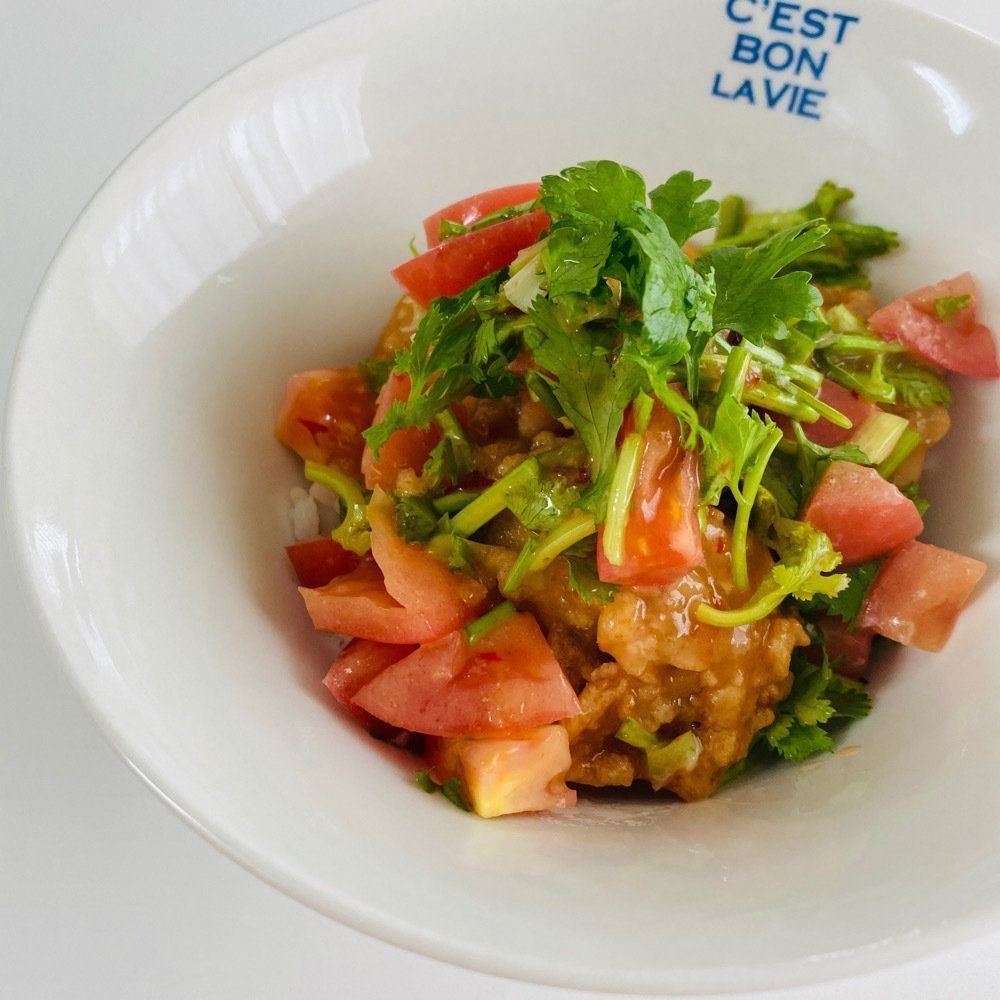 鶏竜田揚げを好みの方法で加熱料理し、その間にスイートチリソースとマヨネーズを混ぜておく。鶏竜田揚げとトマト、パクチーを加えて混ぜ、ごはんにのせてでき上がり。