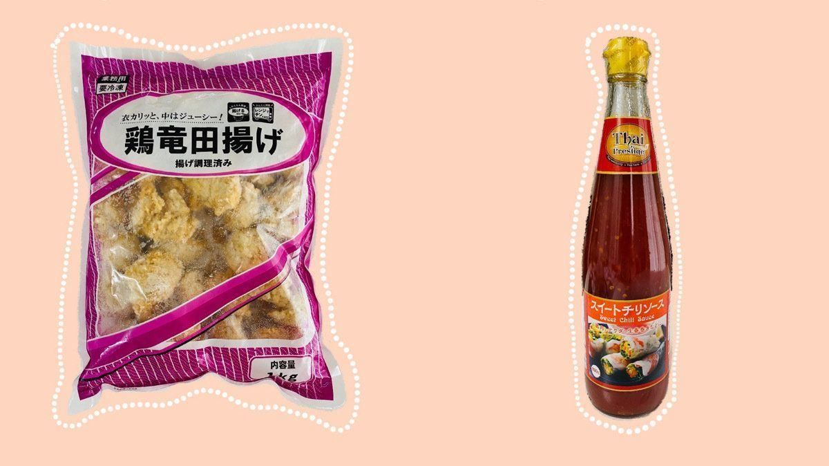 業務スーパーの冷凍鶏竜田揚げとスイートチリソース使用