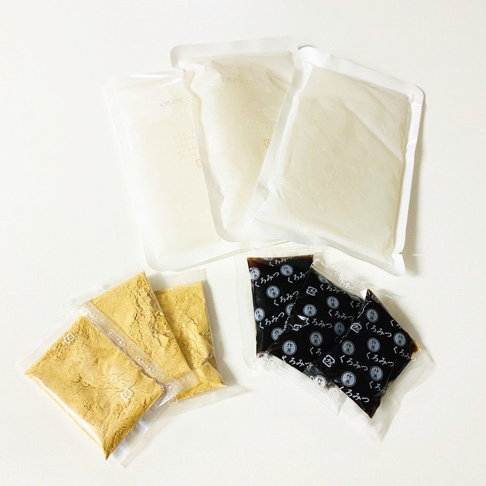 パッケージを開けるとくずもち・黒みつ・きなこがそれぞれ個装で3パックずつ入っています。