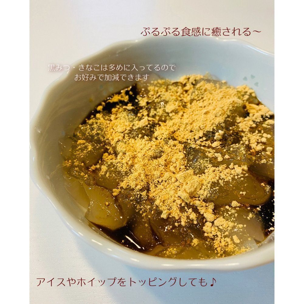 見た目はぷるぷるなのに、食べてみるともっちり弾力のあって新食感!和スイーツの定番の味、黒みつときなこがとてもよく合います。アイスやあずきをトッピングするのもいいかも!