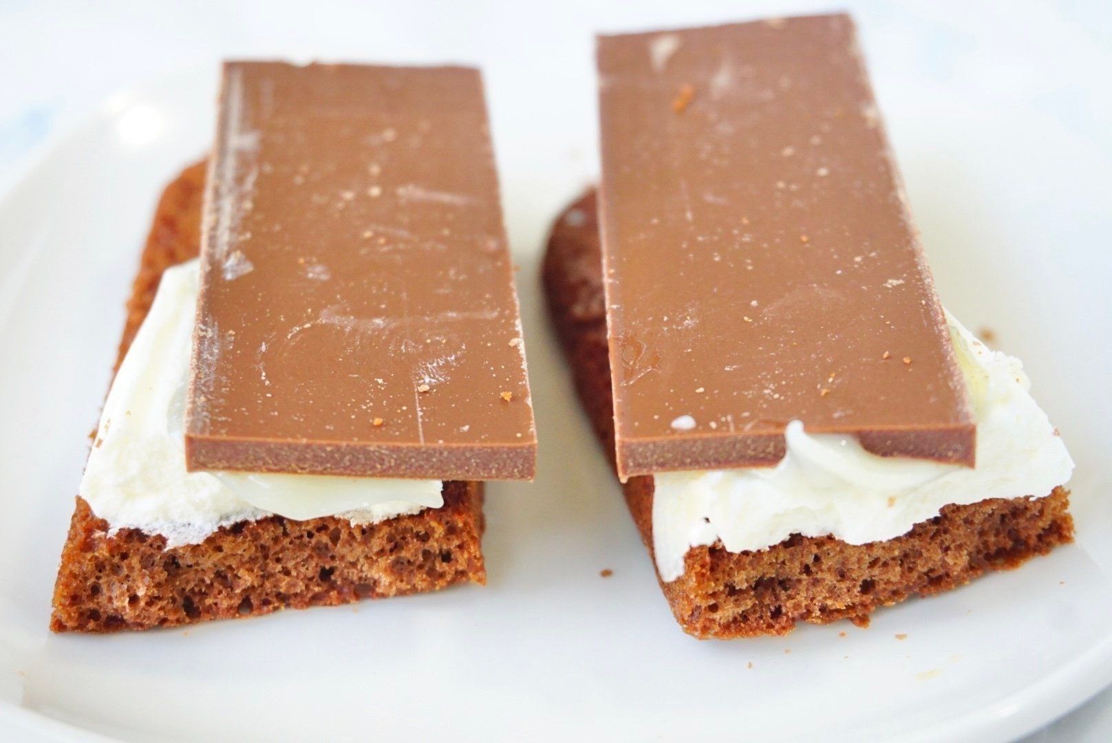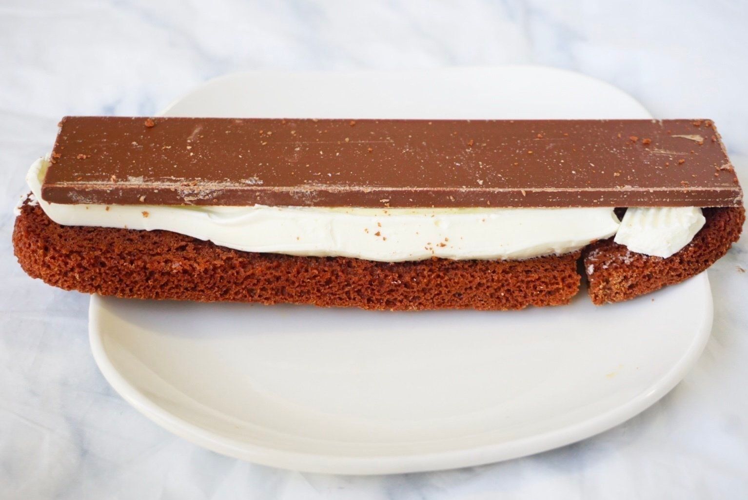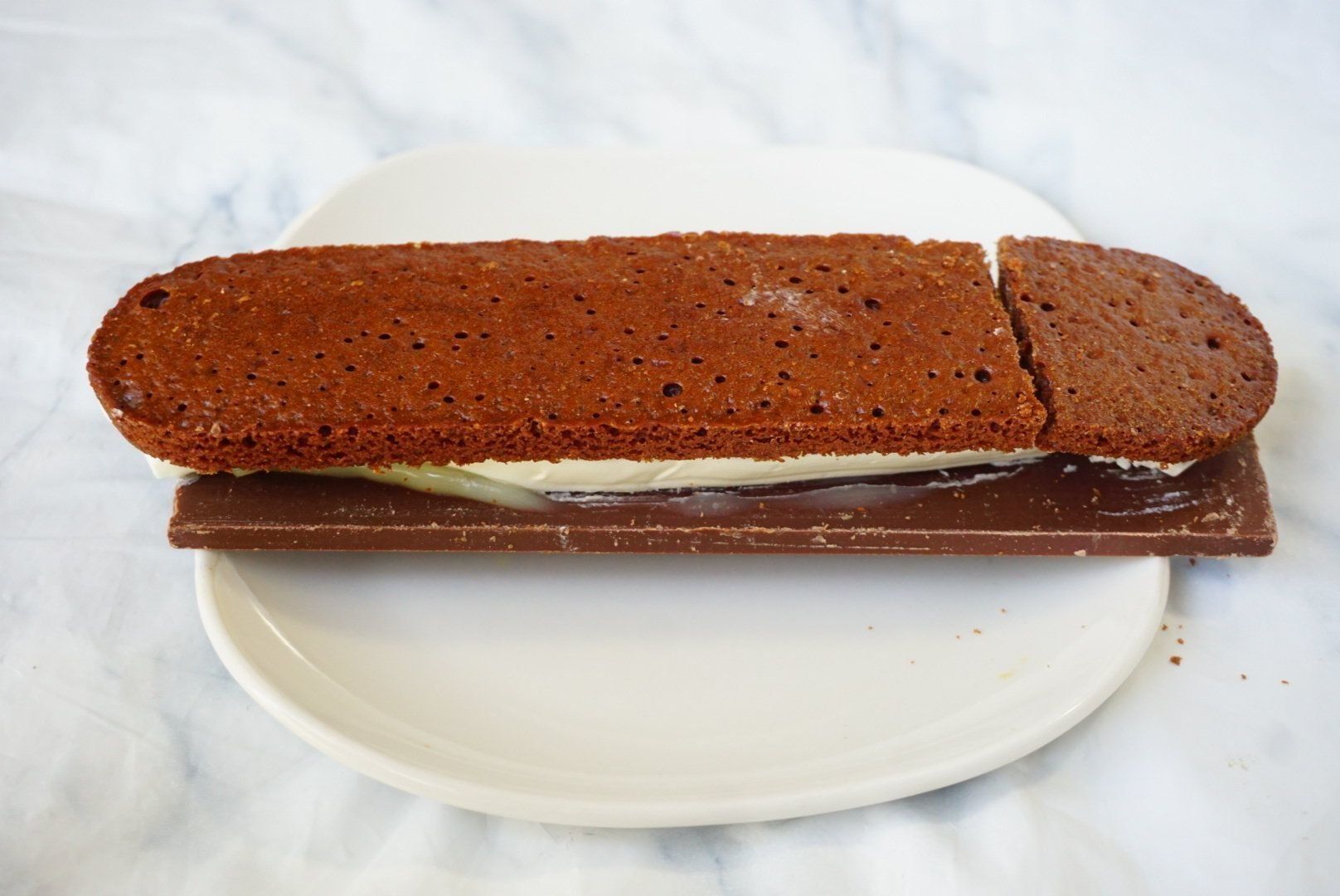 ココア風味クッキーと板チョコで、ミルク風味クリームとミルクソースを挟んでいます。