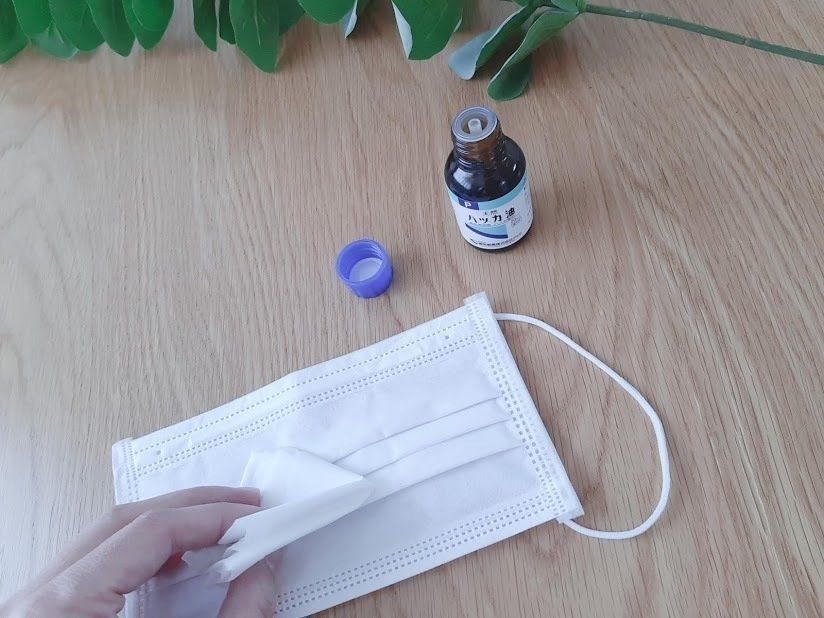 使い捨てのマスクって新品でも独特なニオイが気になりませんか。ハッカ油をティッシュに少量取り、マスクの外側にポンポンと付けます。ハッカ油の爽やかな香りと清涼感が広がり鼻がスーッとして、快適にマスクを使う事が出来ます。内側だと肌に直接触れてしまうので必ず外側に。それでも充分効果があります。しかし、つけすぎると目もスースーしてしまうので控え目にして下さいね。