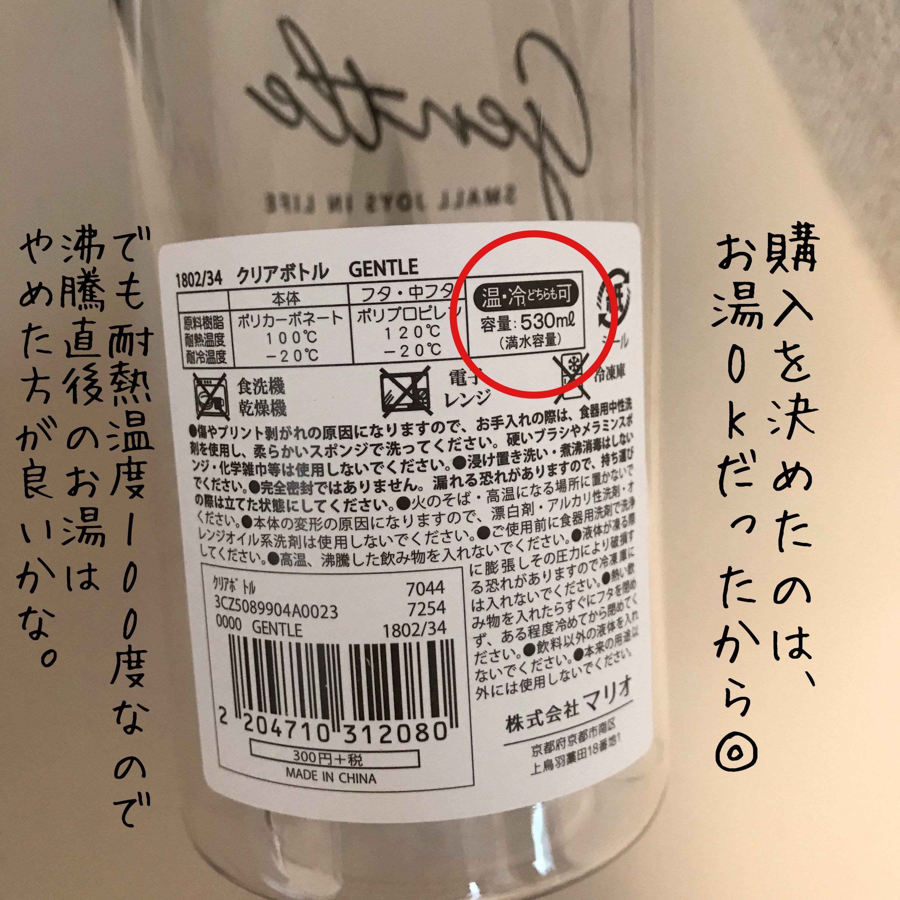 耐熱温度が60度までの100均のマイボトルが多いなか、スリコのマイボトルはなんと100度。温かい飲み物がOKなんです!これなら一年中使えるのでものが増えなくてよいですよね。私が100均ではなくスリコで購入した理由がこれでした。