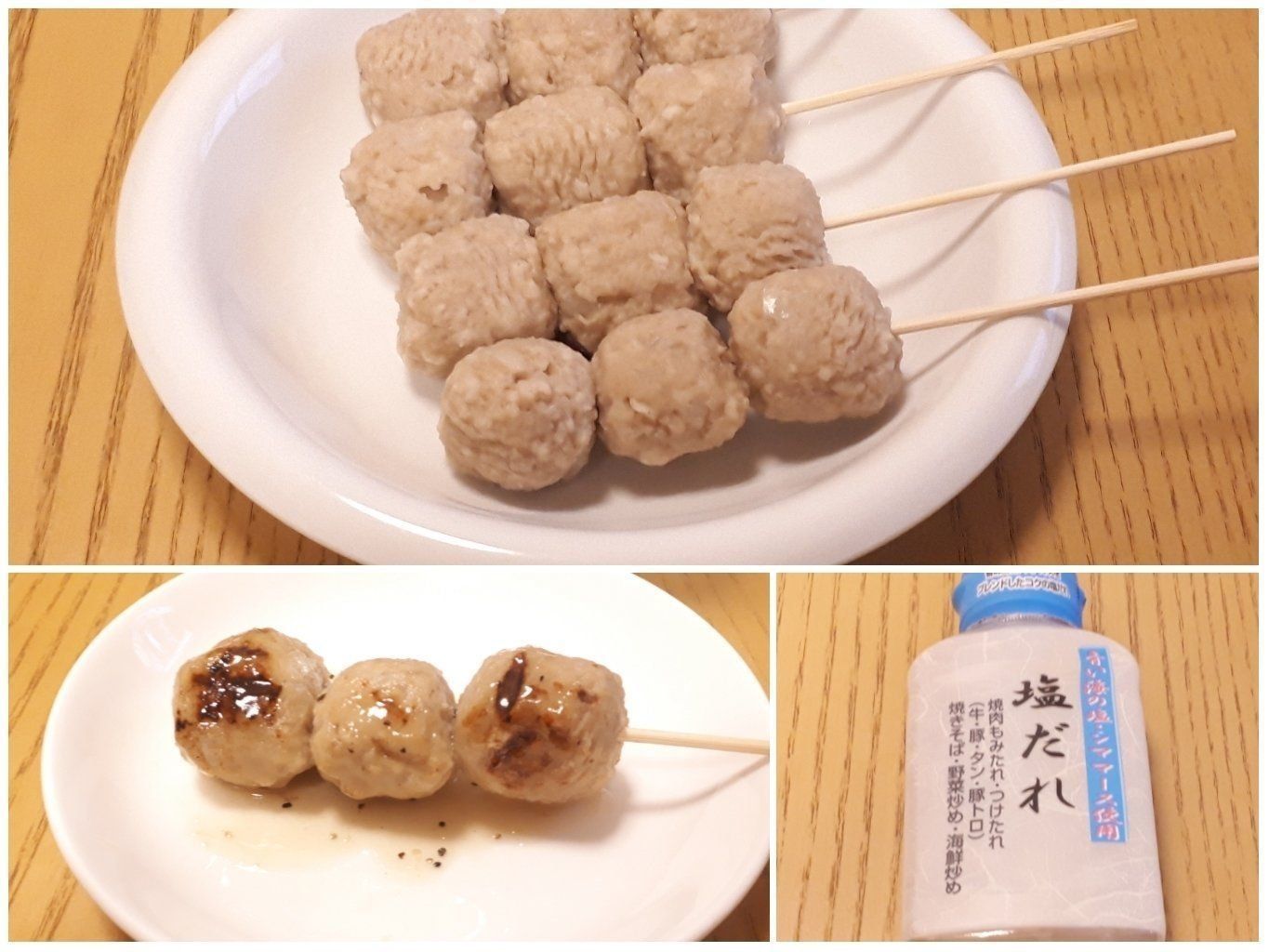 沸騰したお湯で2分ほどゆでて竹串に刺すと、「つくね串」に変身。おうち焼肉のときにホットプレートで焼いて、業務スーパーで見つけた「塩だれ」をかけて塩つくね串に!この塩だれ、業務スーパーの調味料にしては珍しく小ぶりな商品(200g入り、187円)ですが、味はなかなかのものです。