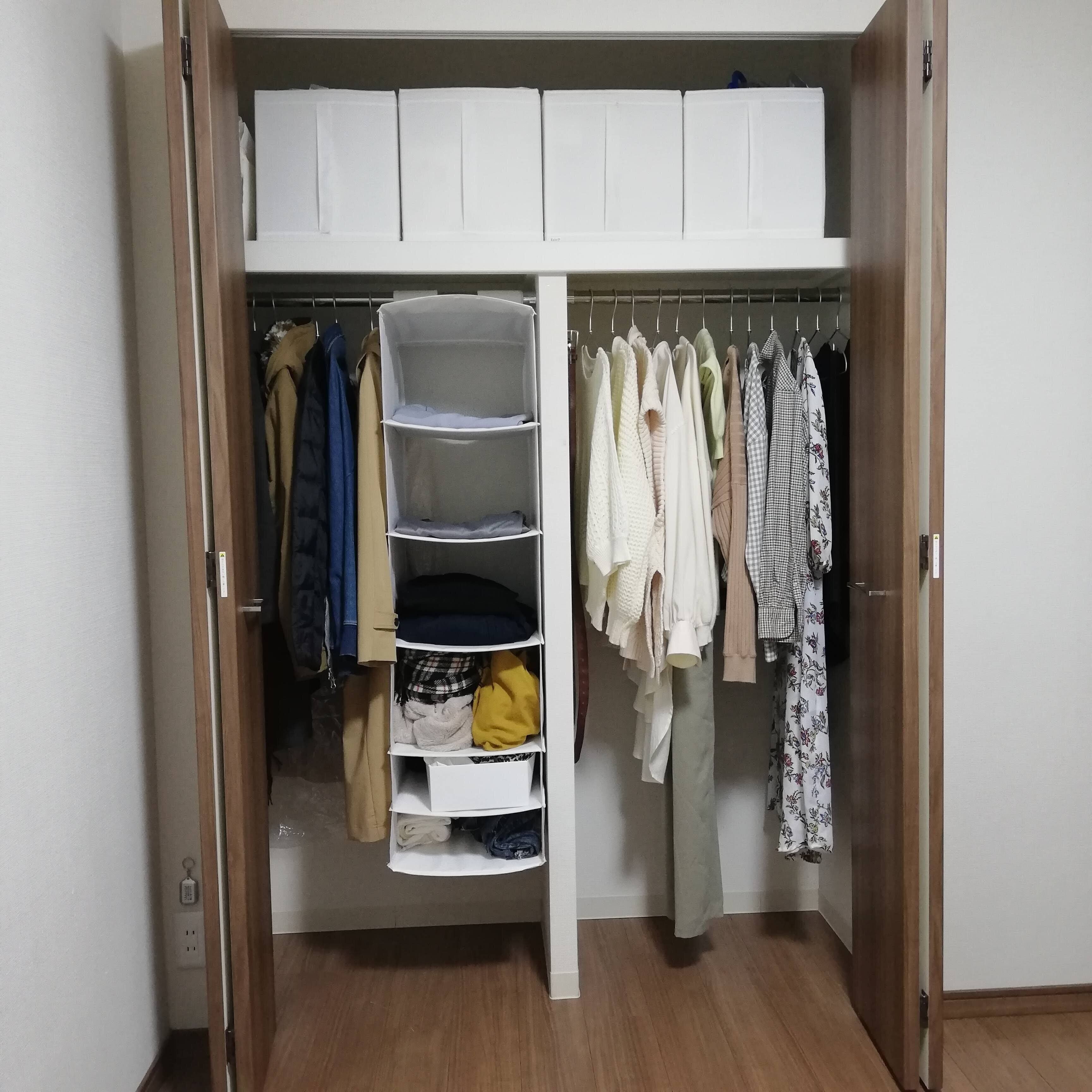季節の変わり目になると衣替えが億劫になりがちですが、シーズンオフの服を数枚畳んで左の吊るす収納に置くだけなので、5分程度で終わってしまいます。