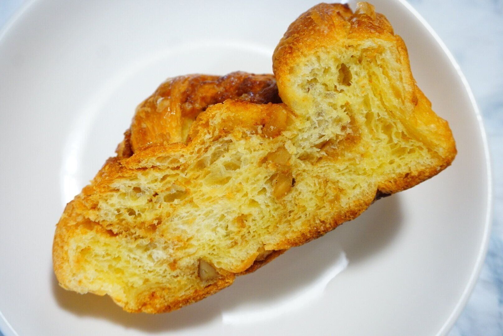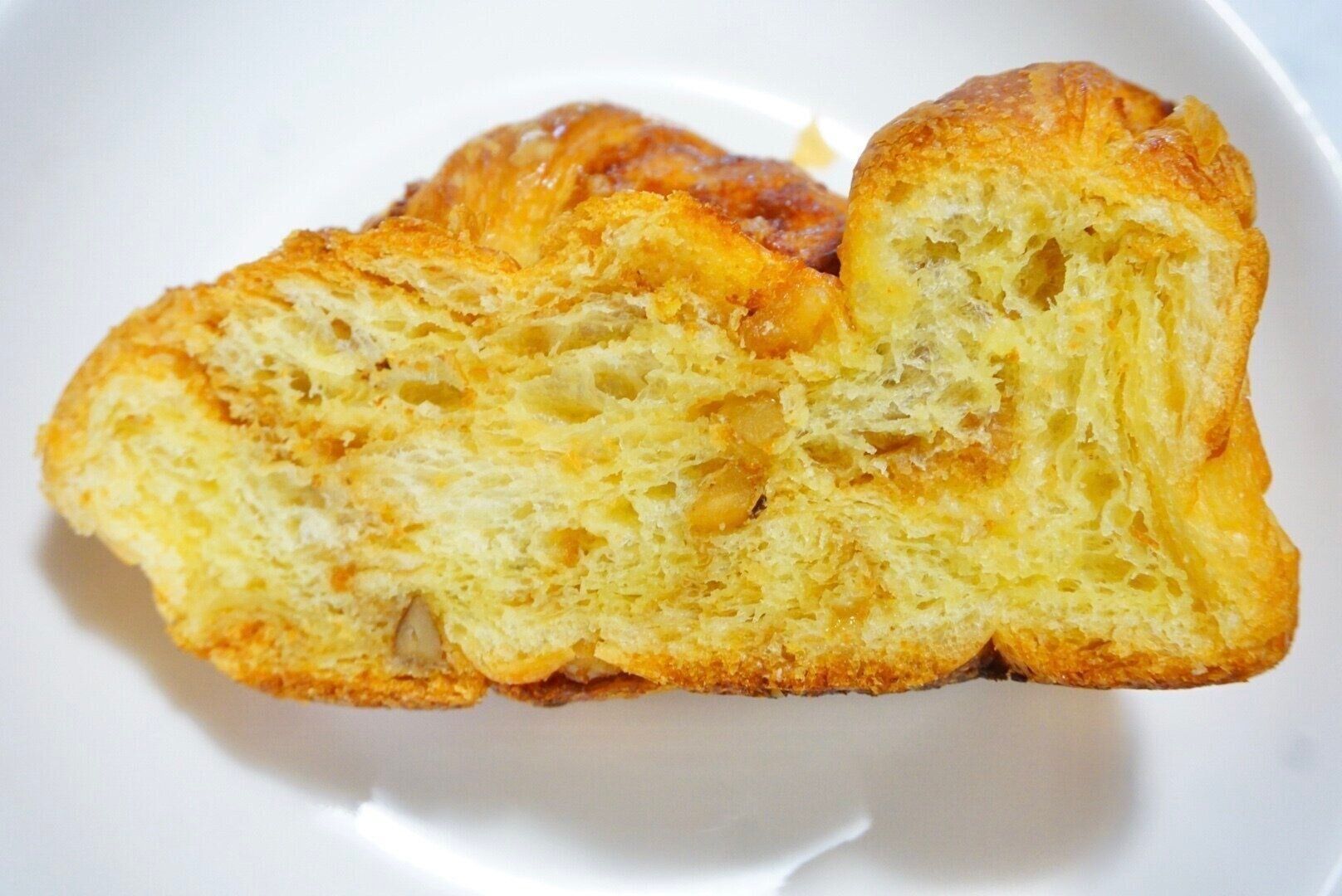 たっぷりの卵を使用したブリオッシュ生地に、発酵バター入りマーガリンとケーキクラム、メープルシュガーを配合した生地に、くるみを折りこんだ菓子パンです。