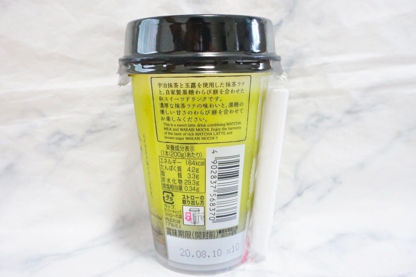 濃厚な抹茶ラテに、ぷるんとした食感のわらび餅が入ったドリンクです。