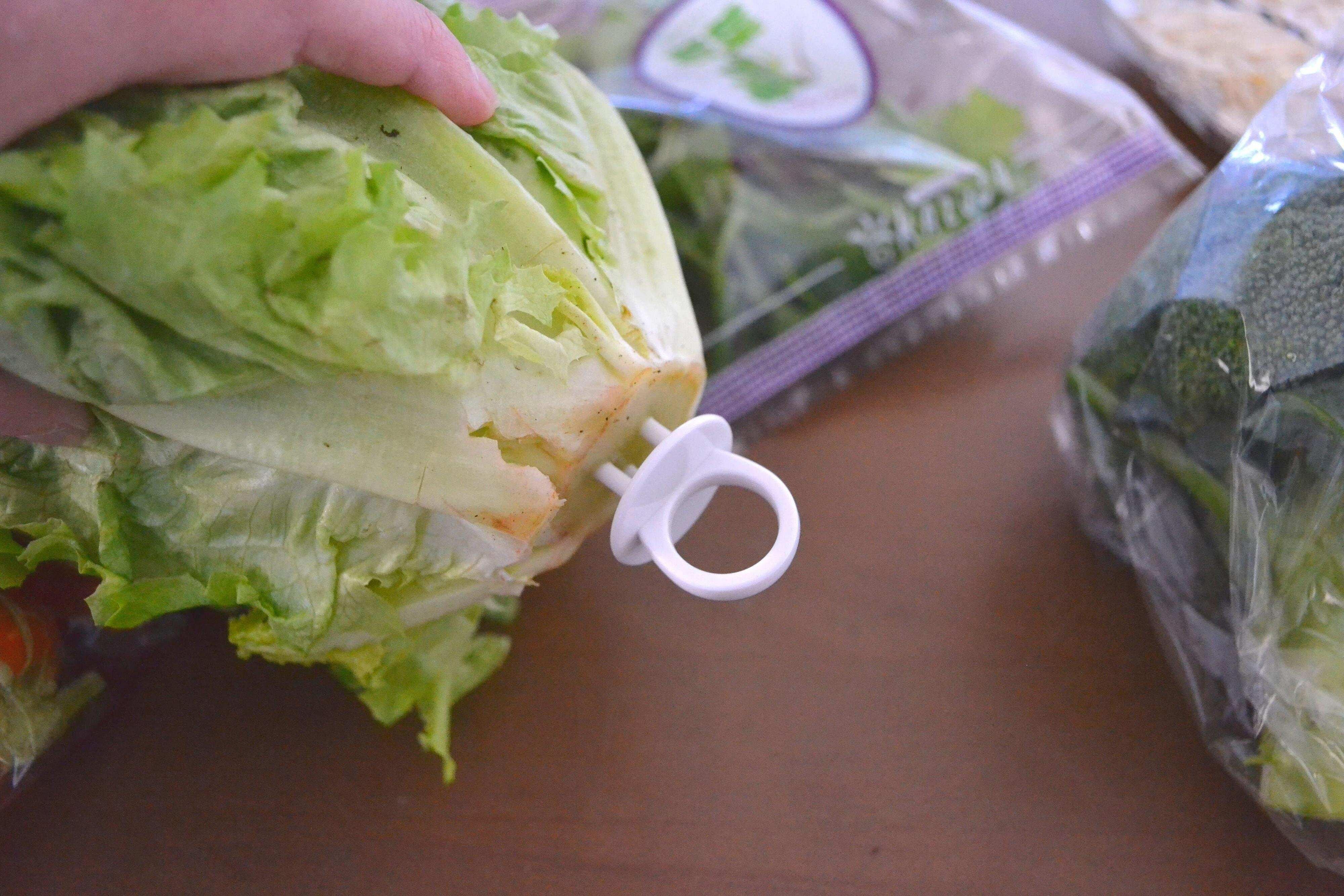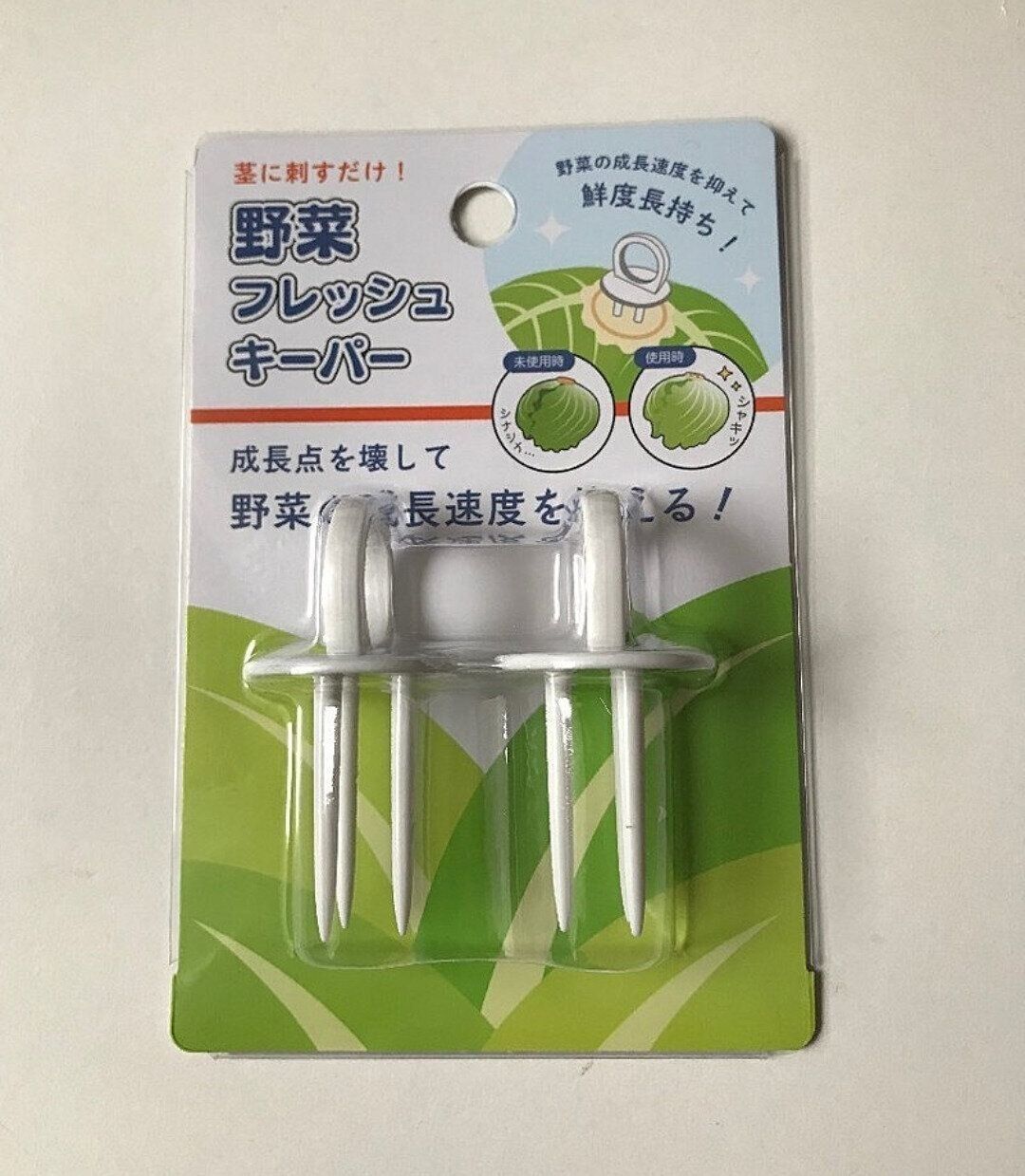 レタスやキャベツは収穫後も芯の部分が葉から栄養をもらって成長しようとし続けます。そのまま保存すると劣化が進むので、芯にこちらの商品を刺すことで成長をストップして長持ちさせてくれるのです。