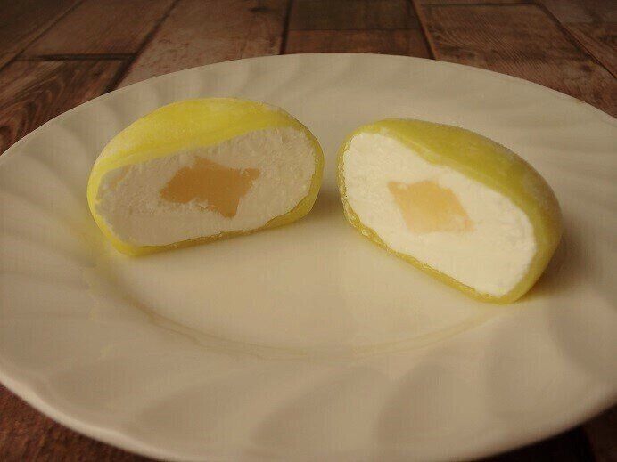 開けてみると、レモン色のとてもキレイな求肥が出てきました。見た目が涼しげでこれからの時期にピッタリです。