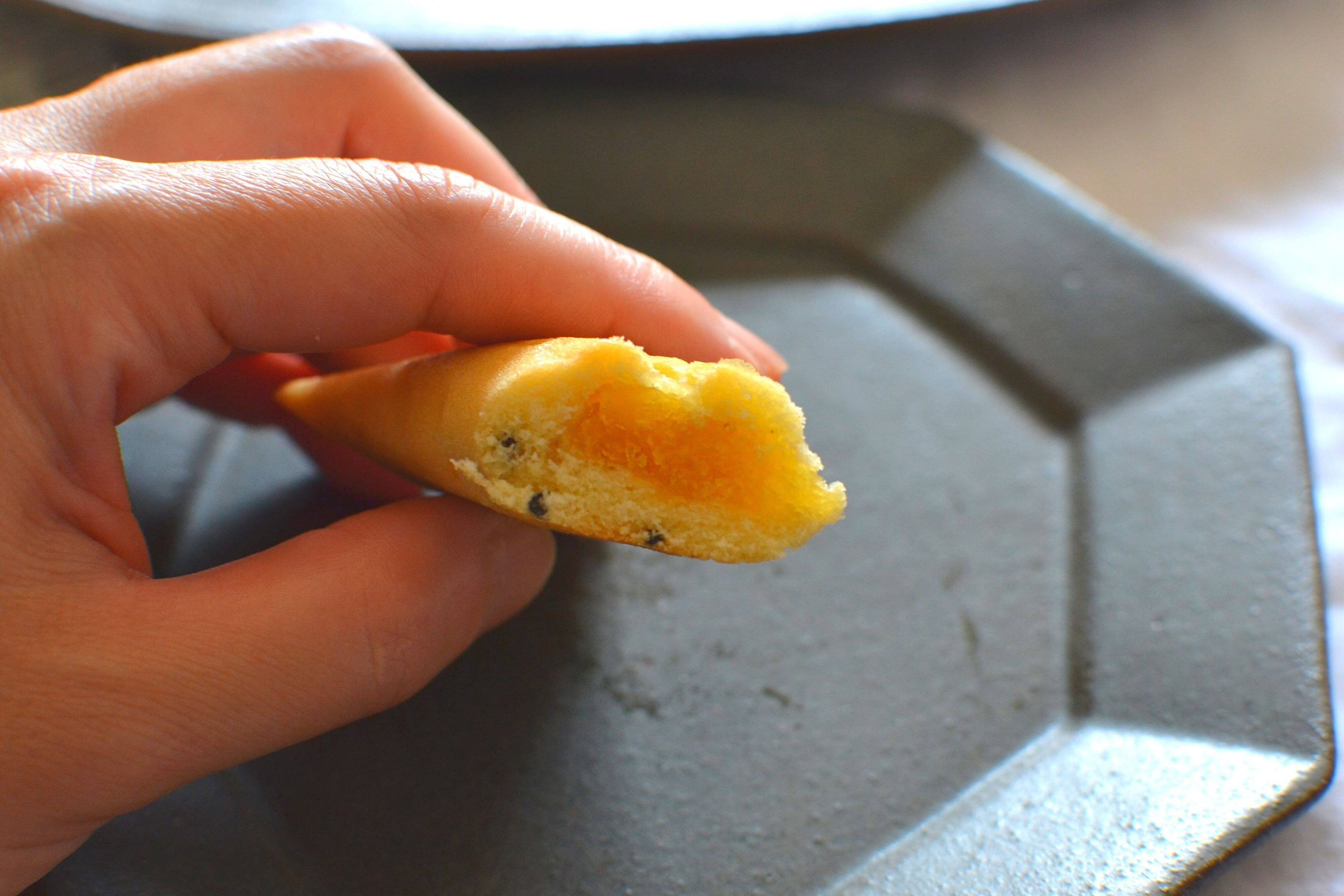 さつまいも味は生地に黒ゴマが入っています。中のあんには、こちらも白いんげんのあんが使われていて、サツマイモも入っているので黄色の芋あんになってました。