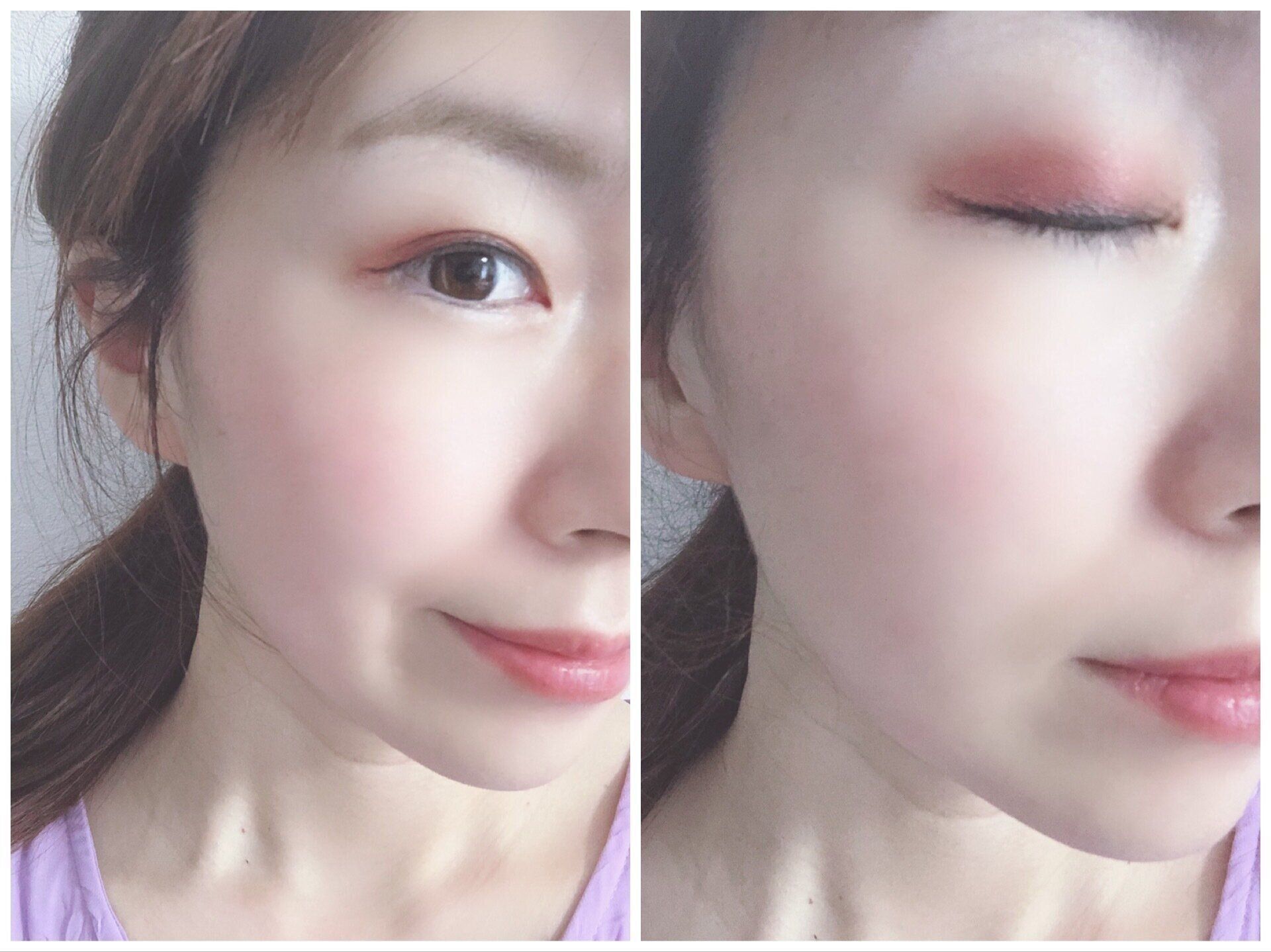 実際まぶたにのせるのと手のひらにのせる色みは若干の違いがあるかと思いますが、こんな感じ。パレットの見た目とそのままの発色。使いにくいかも?と心配していた赤みカラーでしたが、この赤はとても使いやすい色。