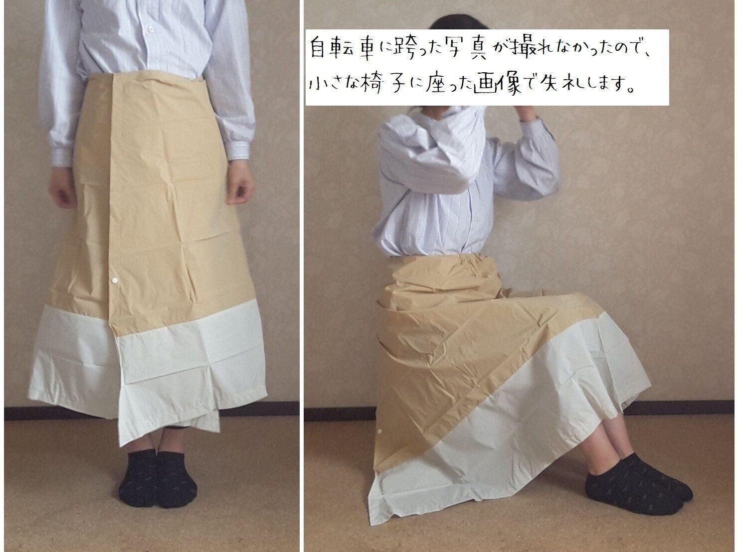 こちらは、巻きスカートタイプで、お腹のところはマジックテープ、中間にスナップボタンが1つついています。自転車を乗るときにもよさそうなので購入しました。