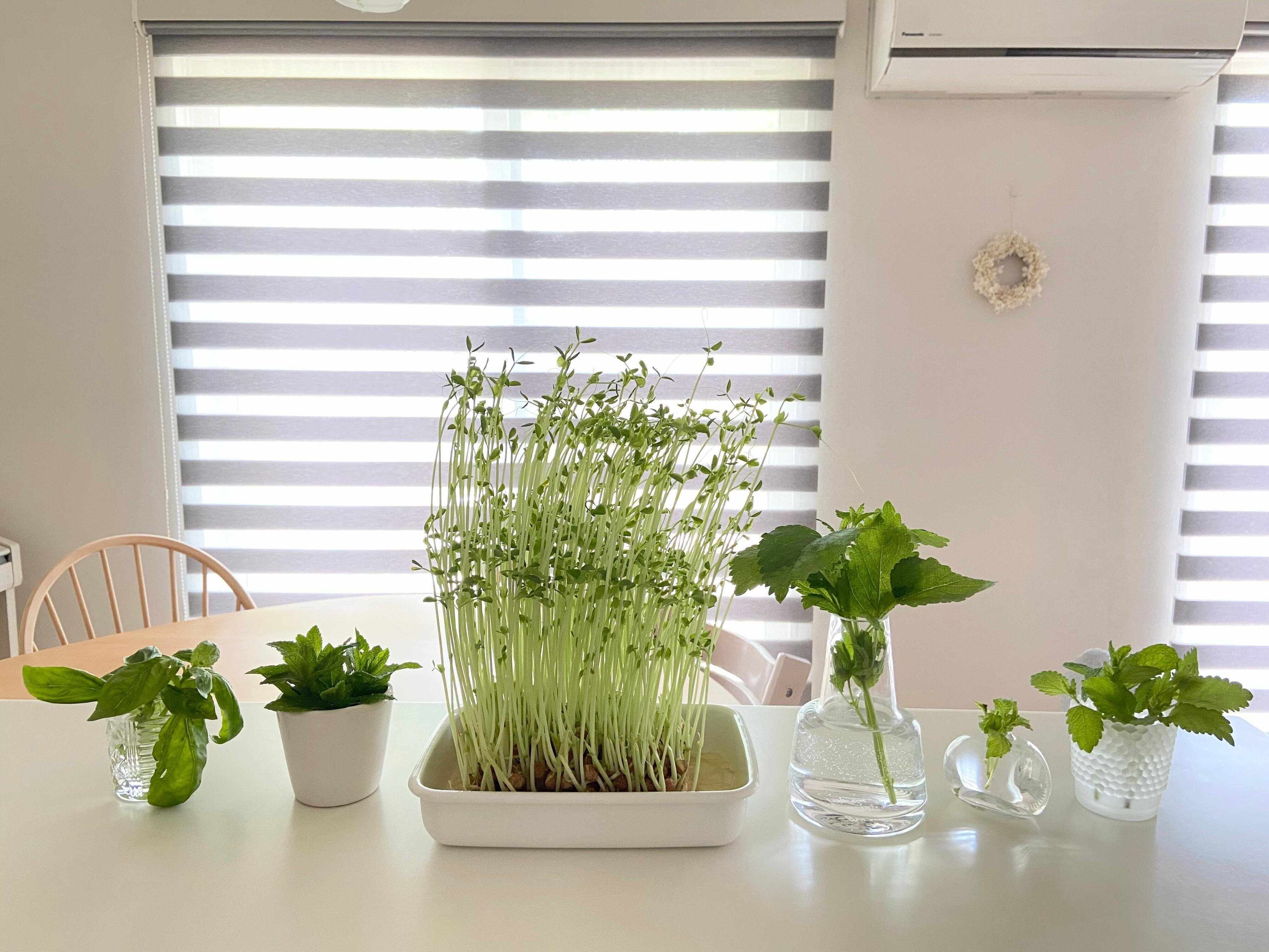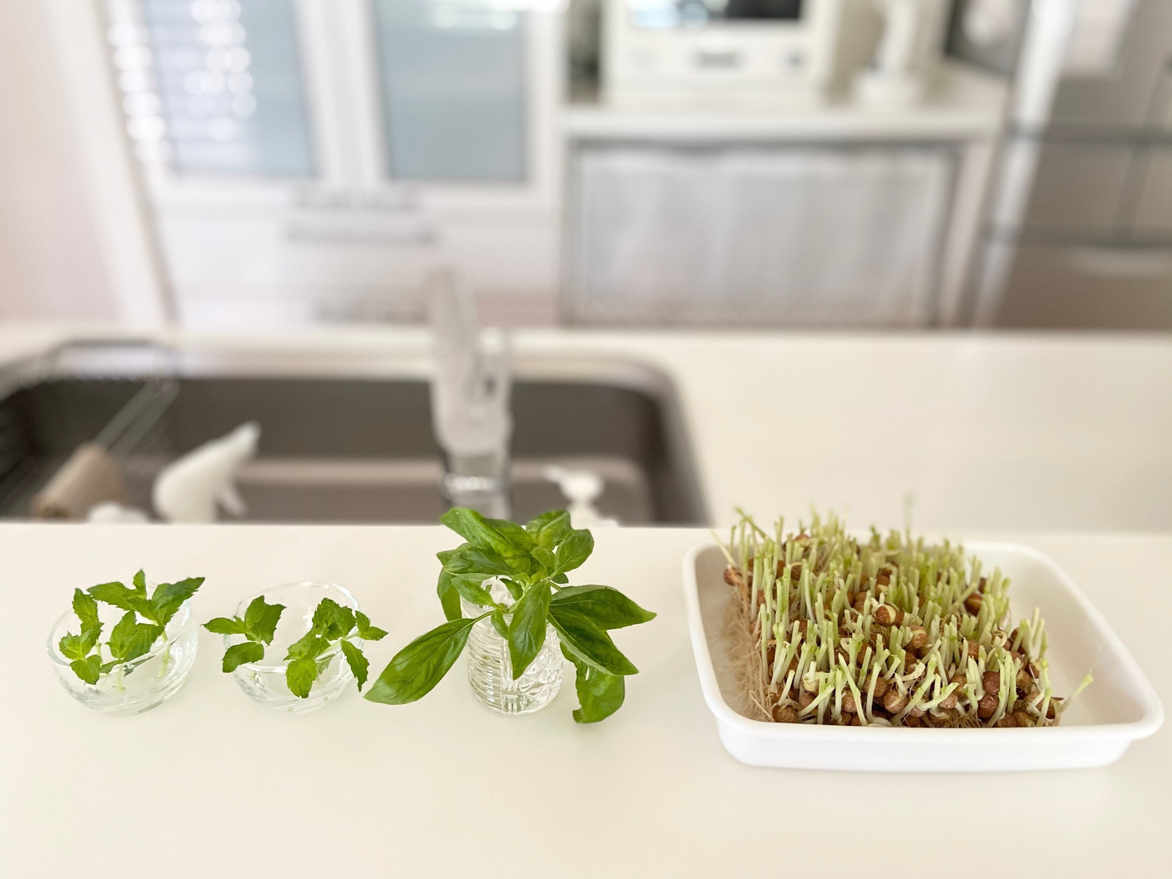今回最初に試してみたのは、豆苗とミントとバジル。食器棚の中にあるものを使って、水につけておくだけなので、とっても手軽に始められるのがメリットです。水だけで家で行うので、虫が湧いたりということもありません。