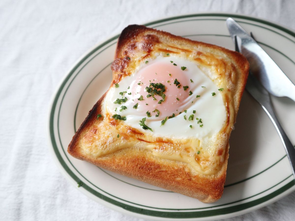 金の食パンのふちにマヨネーズを絞ります。卵が溢れないように土手の役割を果たします。真ん中に卵を落として、オーブンのトースト機能でじっくり焼きます。
