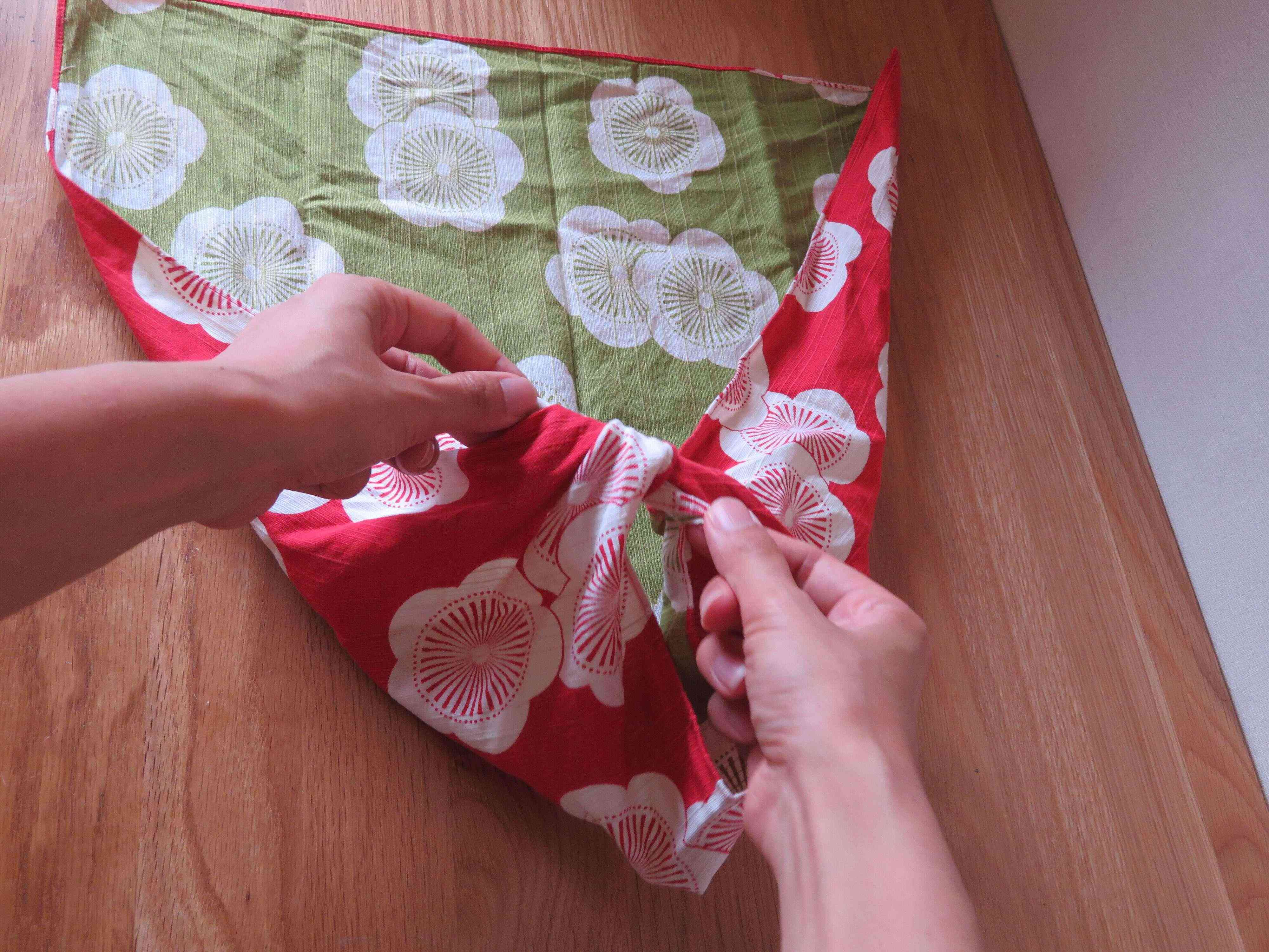 まず、ふろしきを広げて同じ辺上で隣り合った角の部分を強めに結びます。