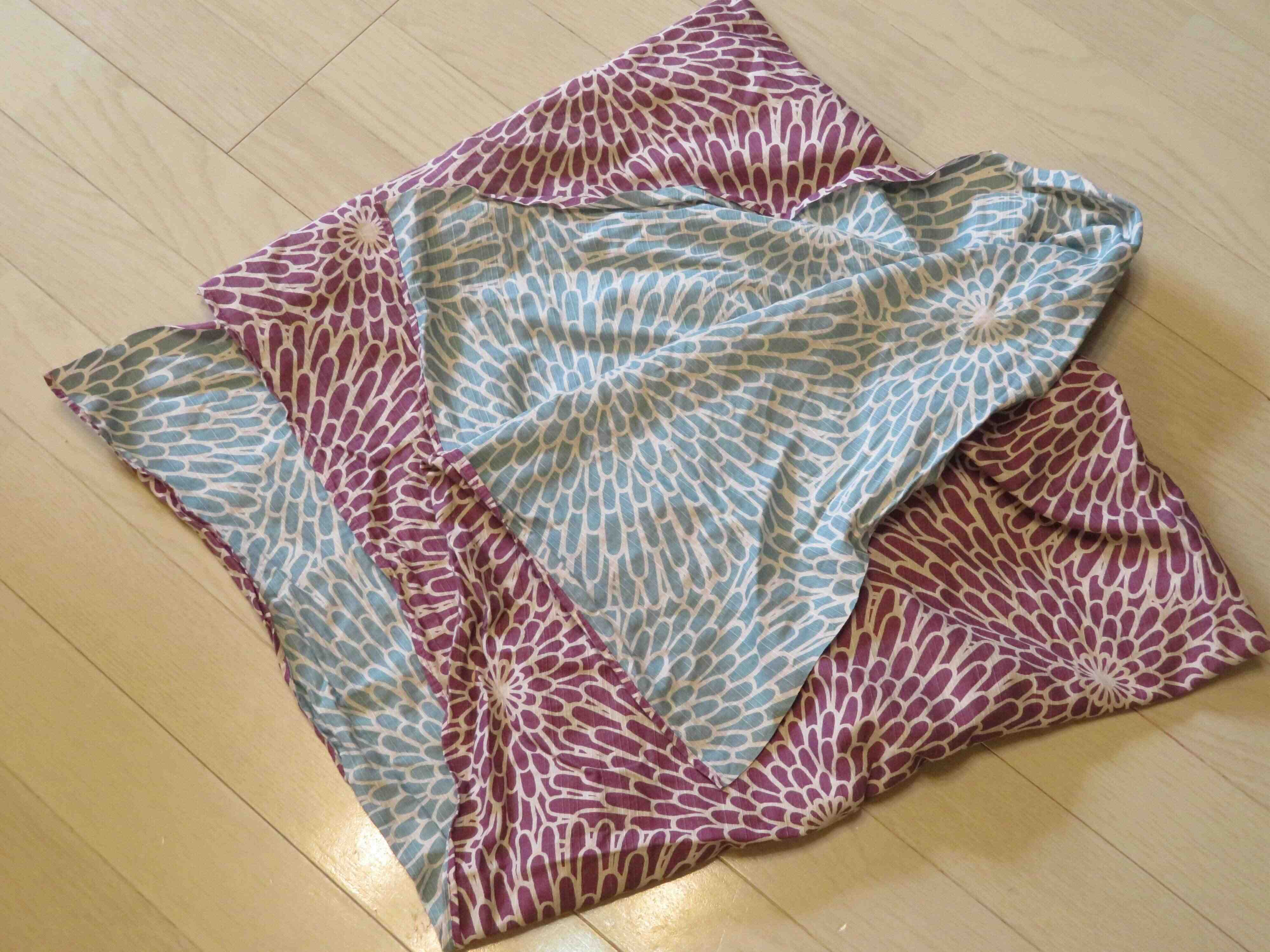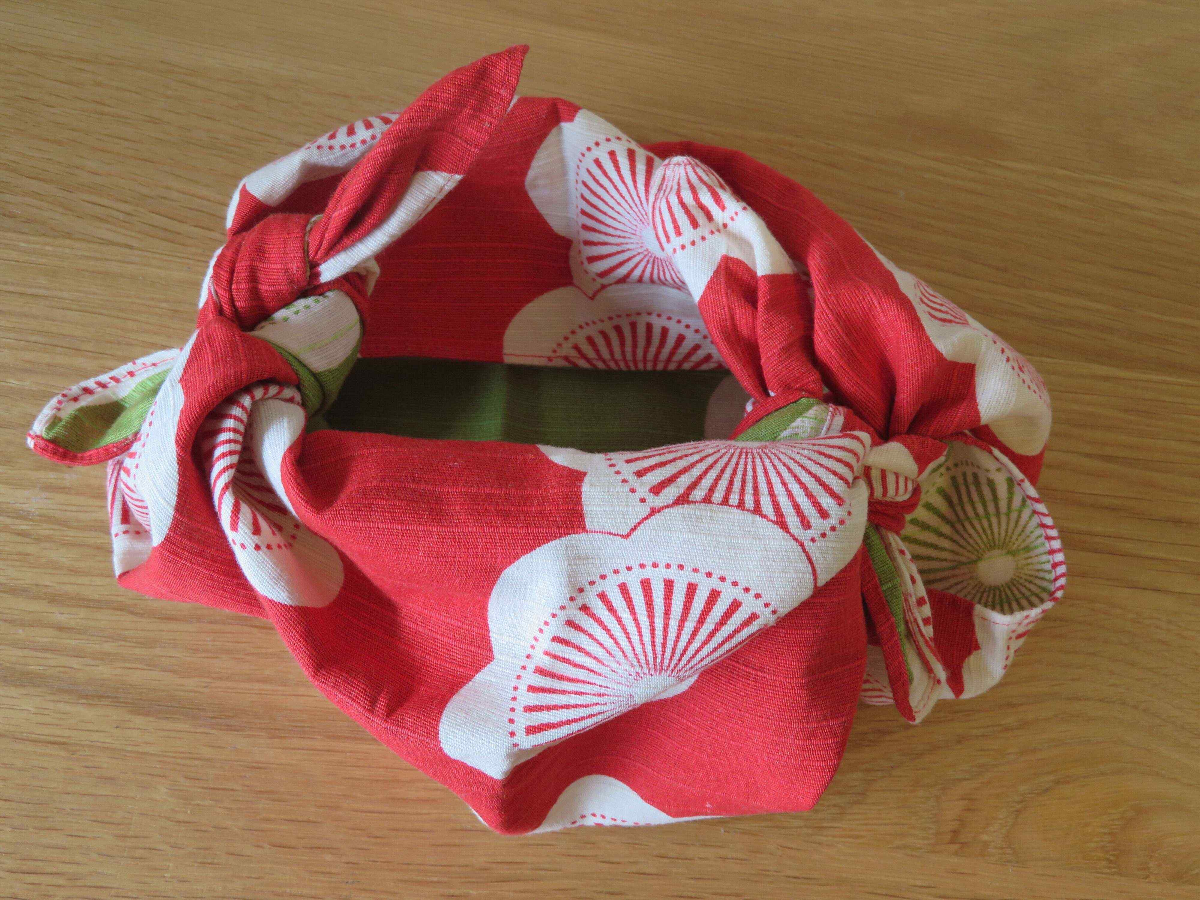 プラスチックの箱に入れるのも味気ない気がしてふろしきで包んだところ、すごく省スペースになり持ち運びも楽に。