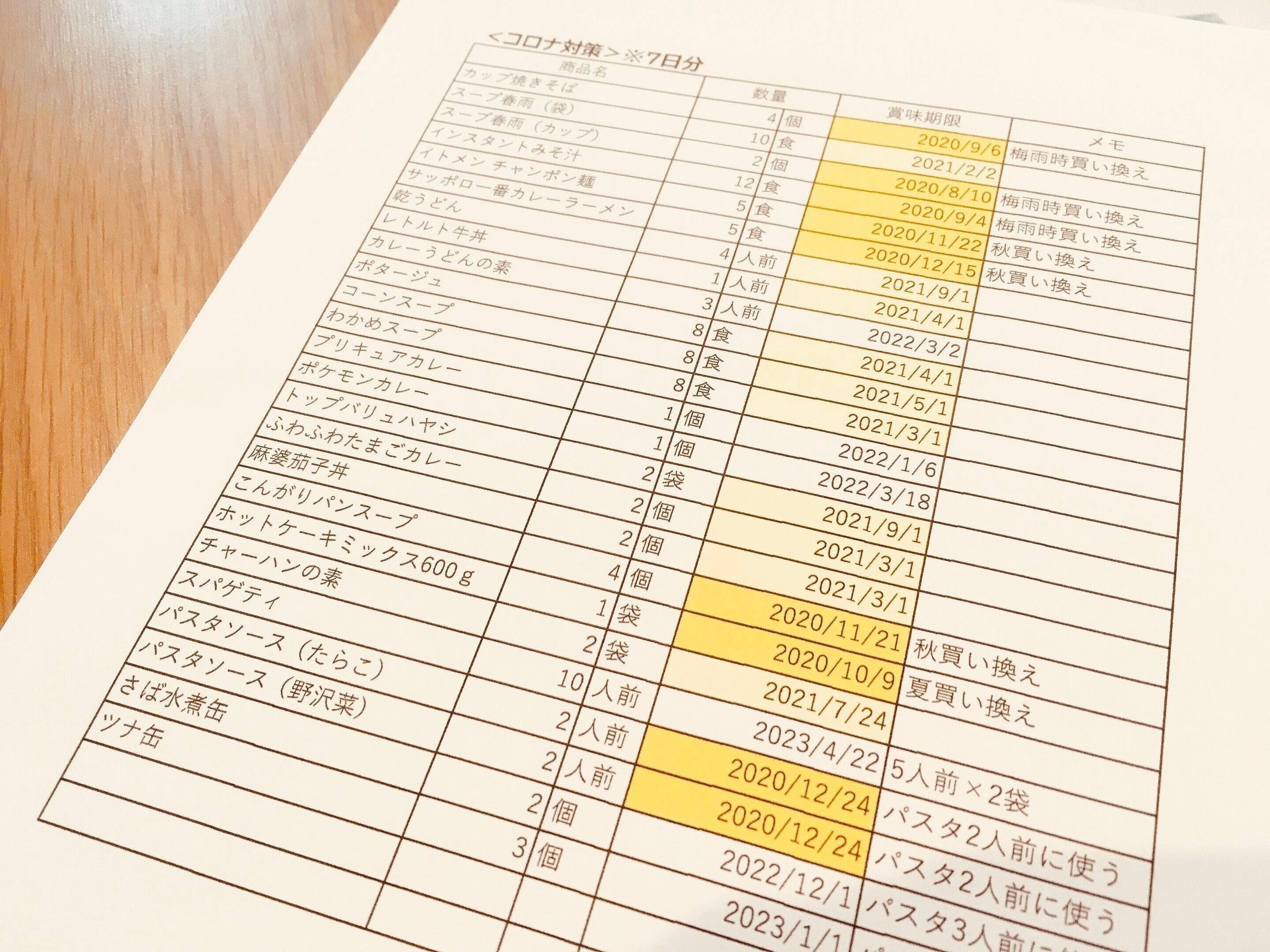 というステップを踏んでいくと、ある程度の安心できるところまでは進めるのではないかと思います。揃えるまでにお金はかかりますが、一度揃えてしまえば、あとは日常予算で回していくだけ!購入したものはリストにして、賞味期限と買い換えタイミングをメモしておくと食品ロスも防げます。