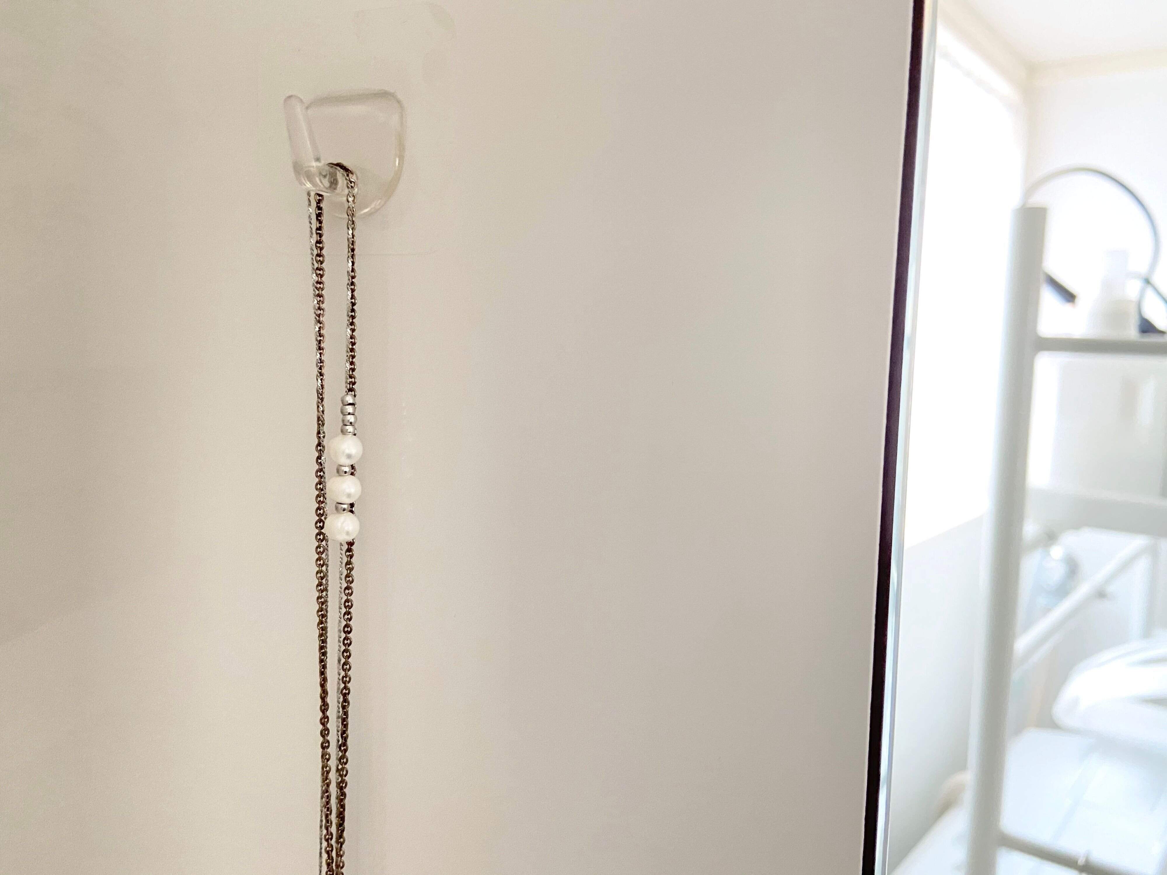 洗面所の3面鏡裏も2箇所使っています。1箇所は私用でネックレスの収納に。もう1箇所は夫用で鼻毛ハサミを引っかけ収納に。