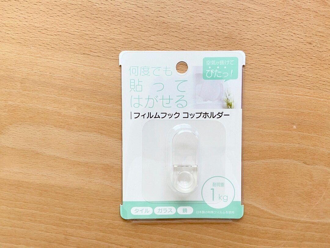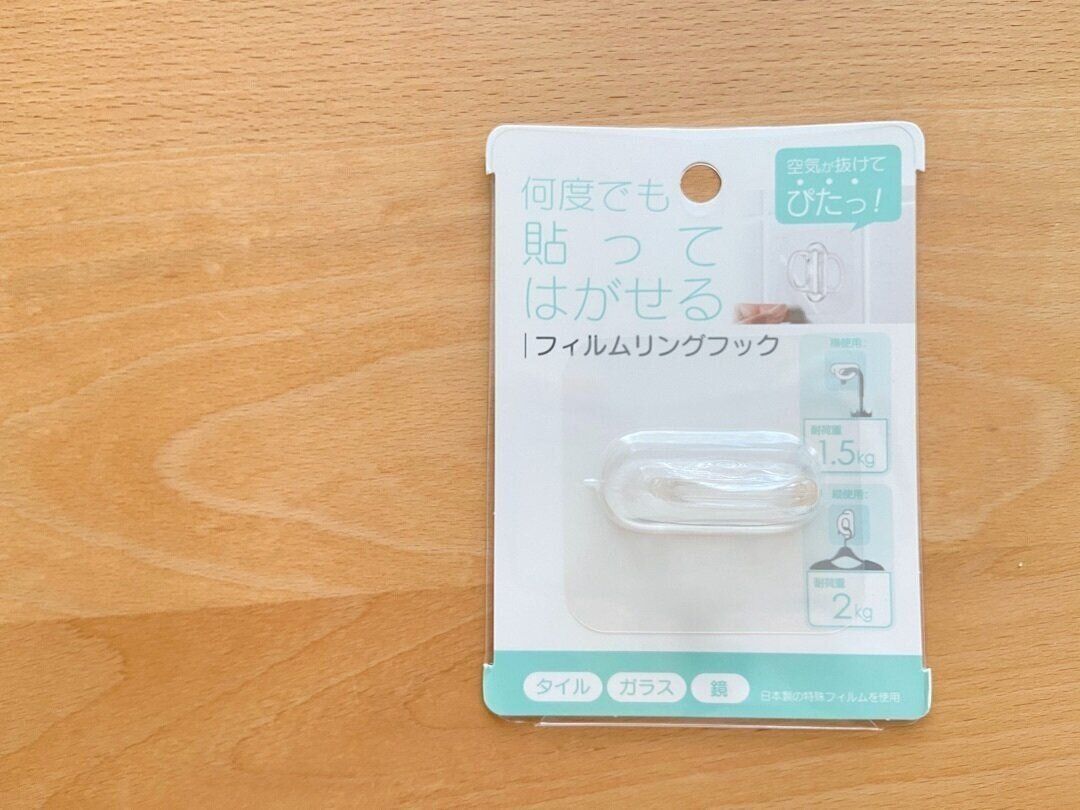 セリアの大人気商品の「フィルムフック」シリーズ。マグネットのくっつかないタイル、ガラス、鏡などで使えるフックで、通常のフックと違って空気が抜けてピタッとくっつくので、落ちてくることもなく、そのうえ何度でも貼ってはがせる便利な神フックなんです。