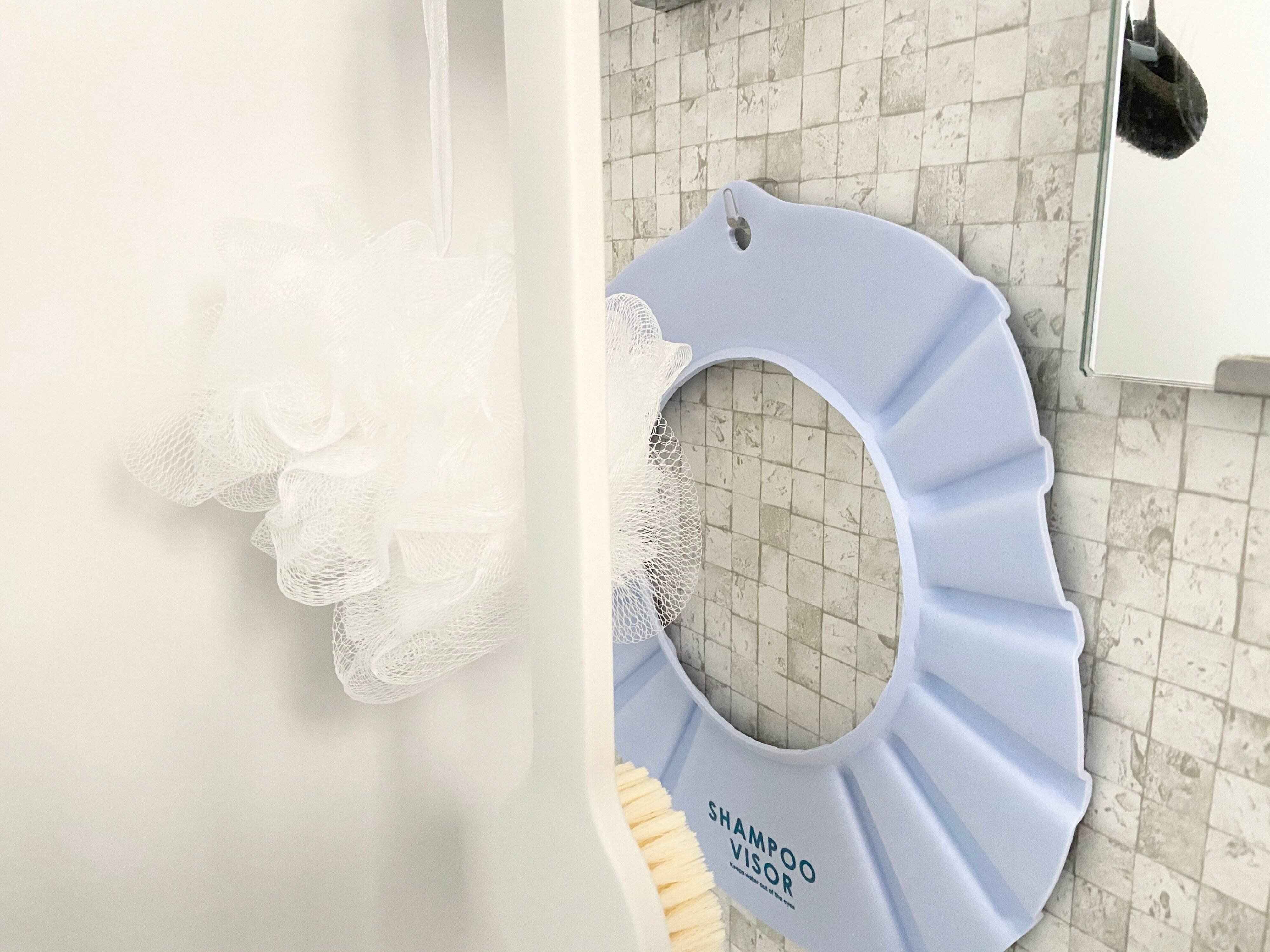 さらにシャンプーハットもフィルムフックを使って浮かし収納にしています。