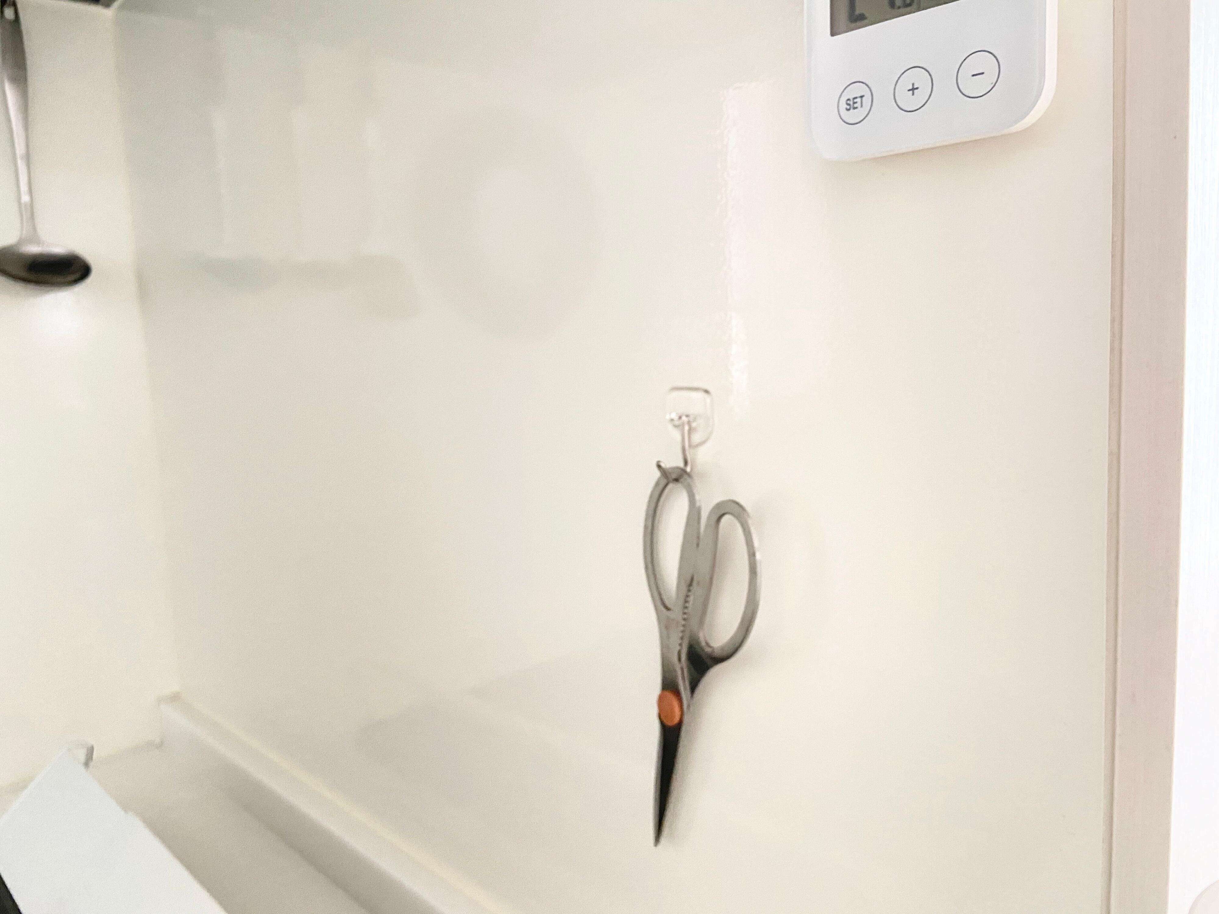 わが家では引き出しを漁るようになった、2歳長男への対策として、キッチンバサミを壁面に浮かし収納するのに使っています。