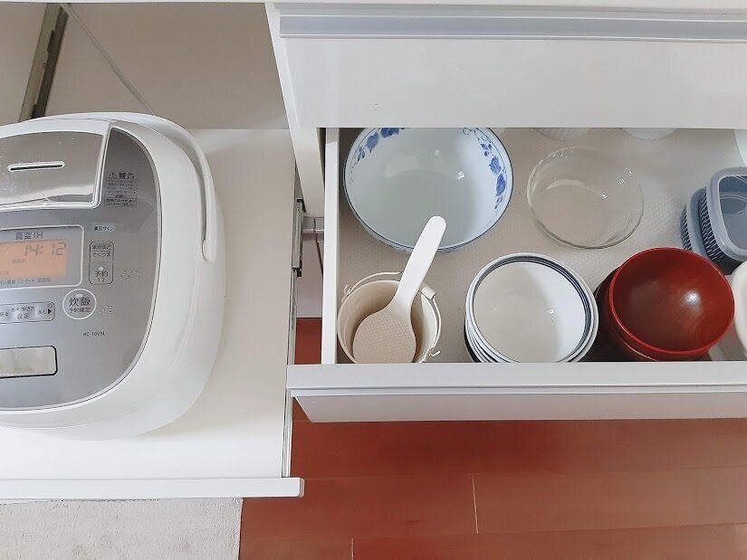 毎日のご飯をよそう作業も分担。子どもにキッチンでの家事を手伝ってもらいやすいように、食器類の収納の工夫しています。炊飯器の横にお茶碗としゃもじをいっしょに収納することで、ご飯をよそってもらいやすくしてます。