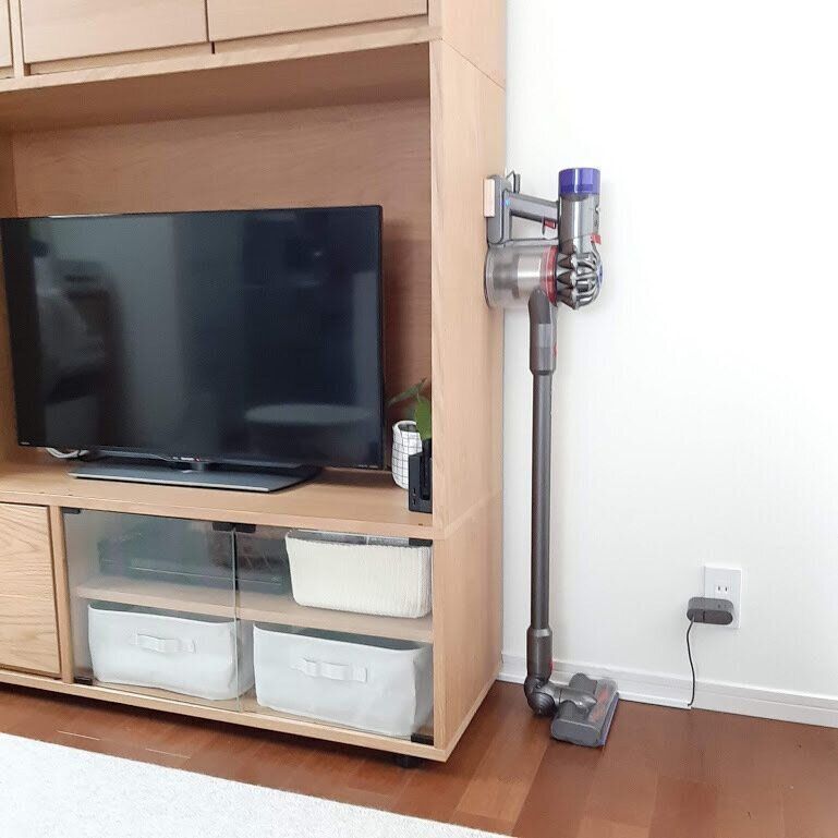 リビングのすぐに手に取れる位置に掃除機を置いています。見た目は若干悪いですが、充電コードを外すだけですぐに掃除機をかけることができるんです。