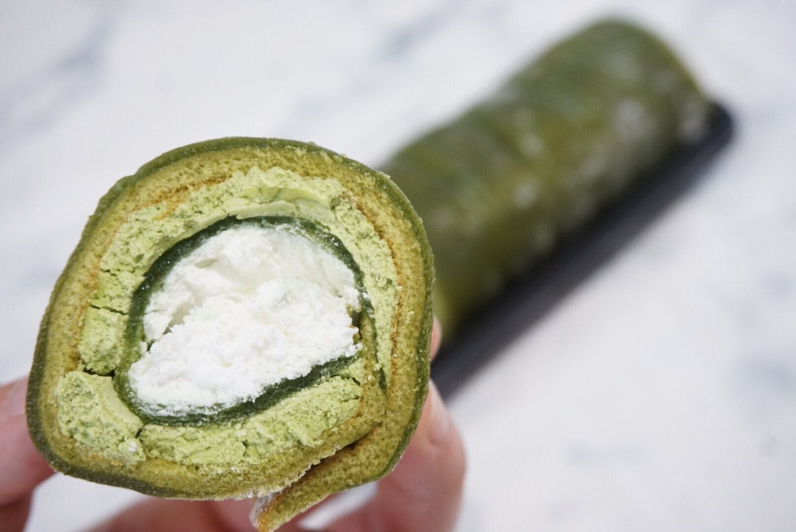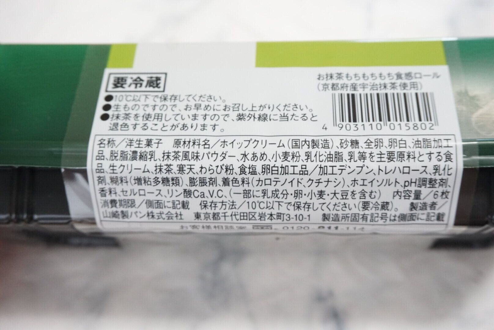 京都府産宇治抹茶を使用した抹茶味のもち食感生地と求肥生地を重ねて、抹茶クリーム、ホイップクリーム、抹茶味の求肥生地を間に包んだロールケーキになっています。6切れで352円。一つあたり58円程度ですね。