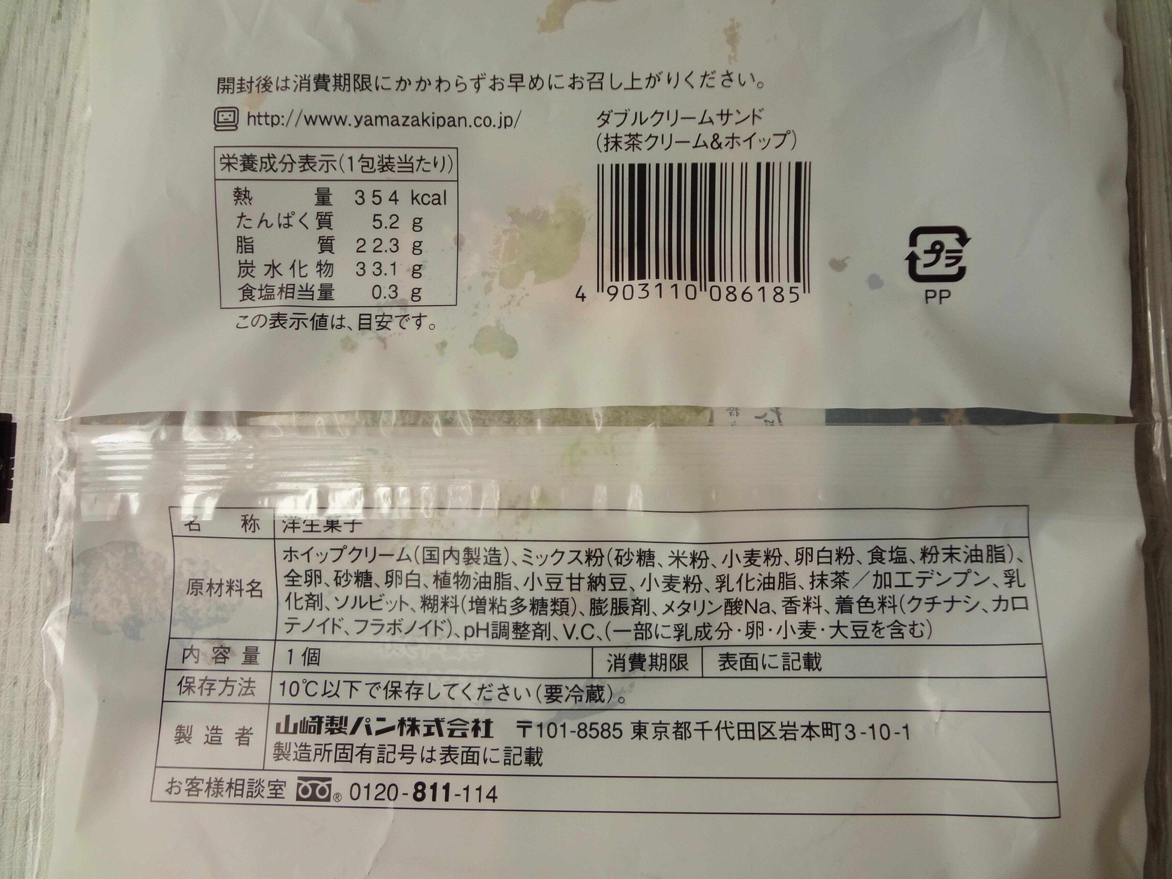 原材料と栄養成分表示はこちら。1個のエネルギーは354kcal。クリームたっぷりなのでちょっと高めです。