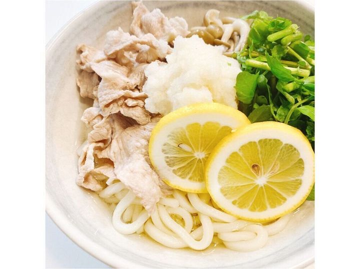 塩レモンおろしを、ゆで豚と一緒に冷たいおうどんにしてみました。