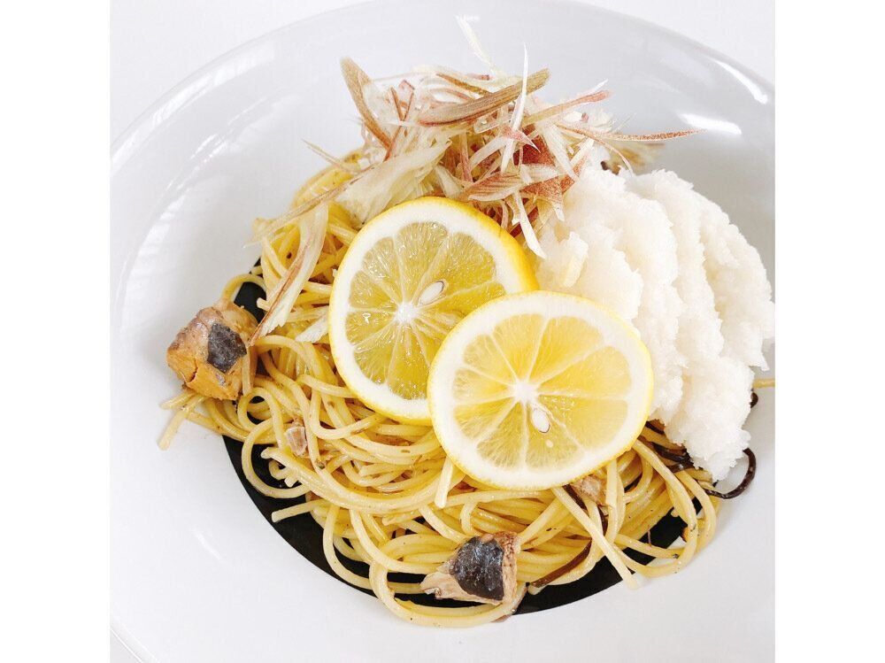 塩レモンおろしのせサバ缶と塩昆布のパスタ