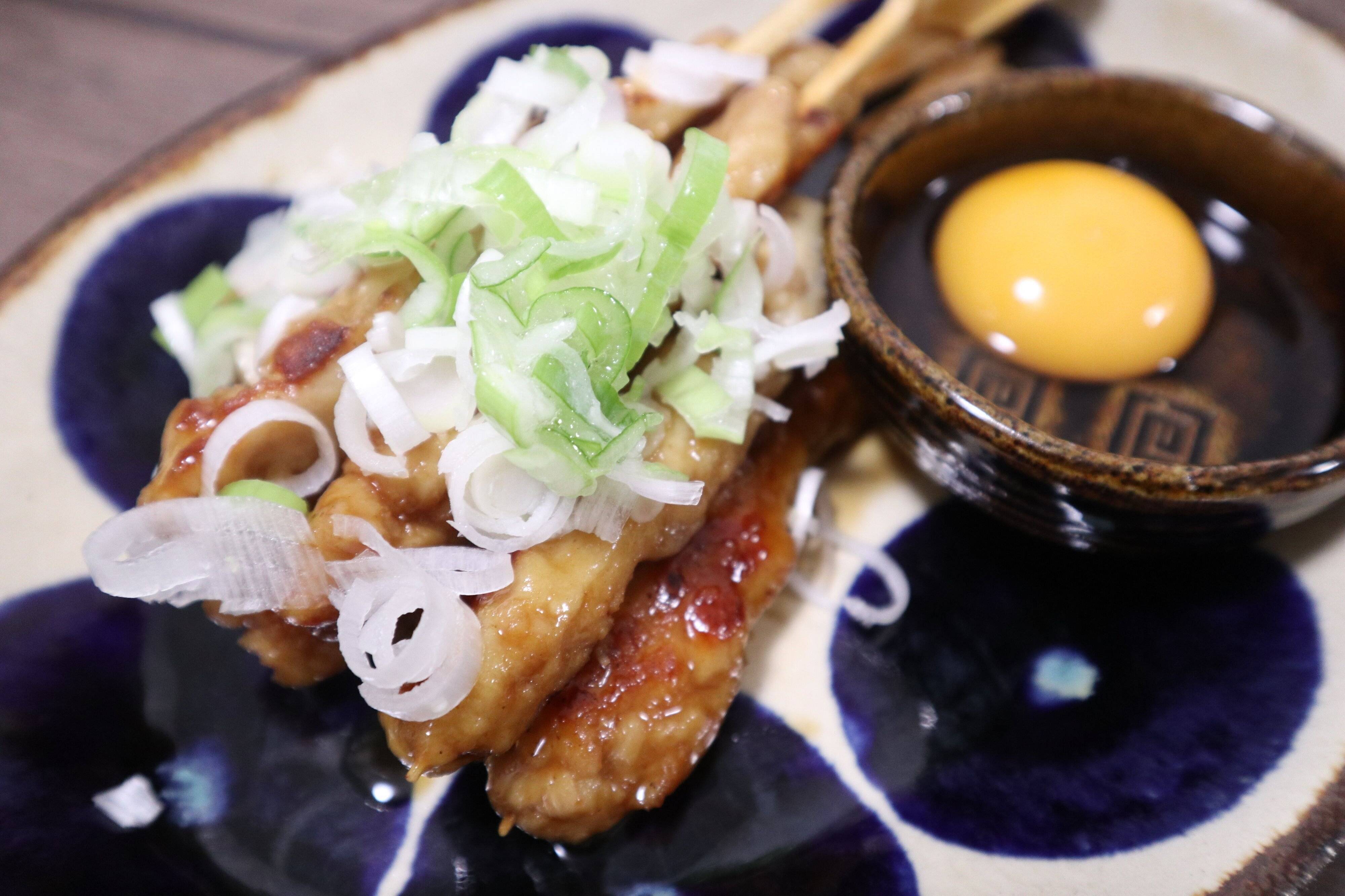 照り焼き味をつけたつくねにネギと卵黄を添えて、卵黄をからめて食べます。それだけで一気に居酒屋風に。