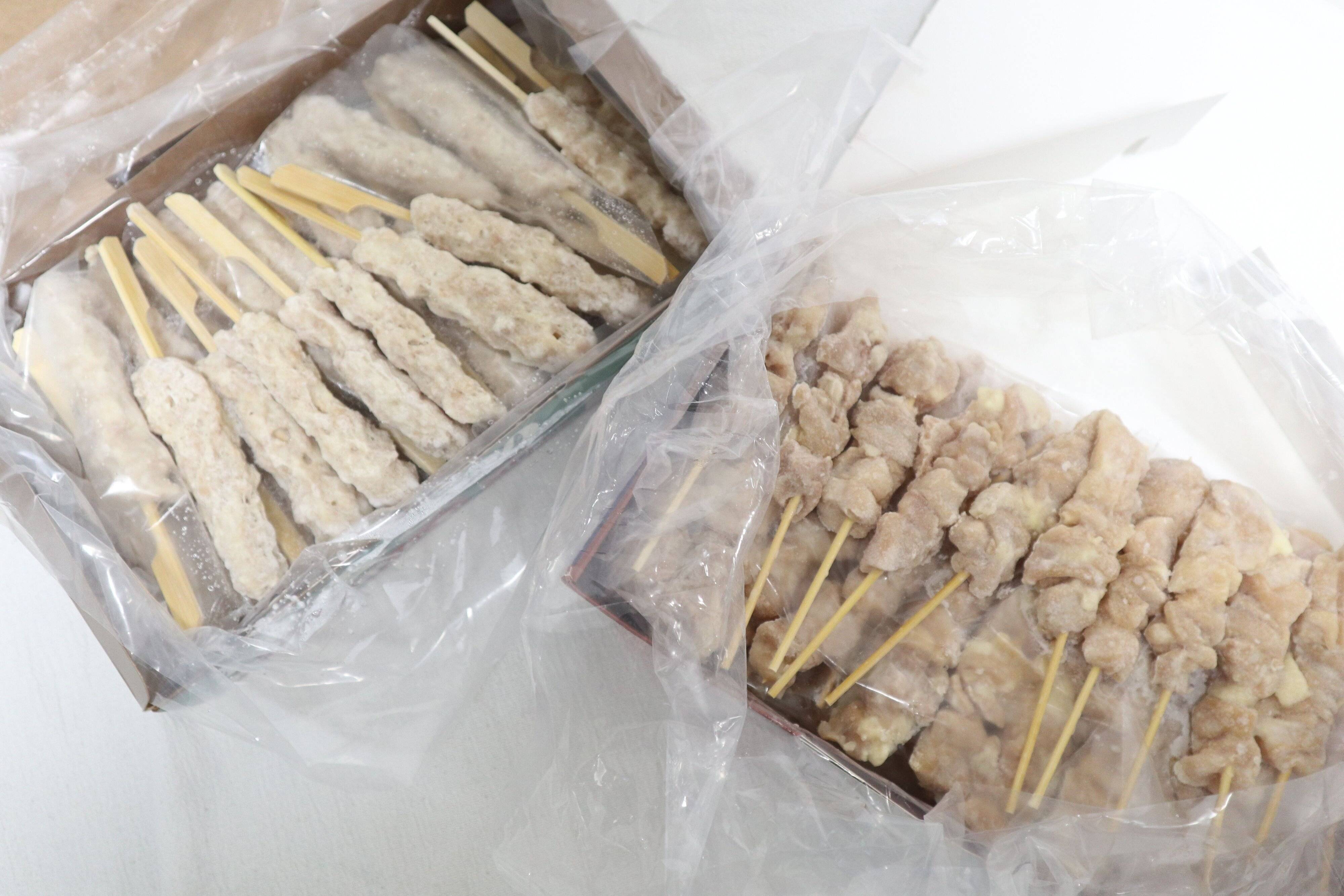 業務スーパーで売っている大容量の冷凍焼きとり。もも串は50本入り990円で、1本あたり20円。鶏つくね串は50本入り1,080円で、1本あたり22円となっています。