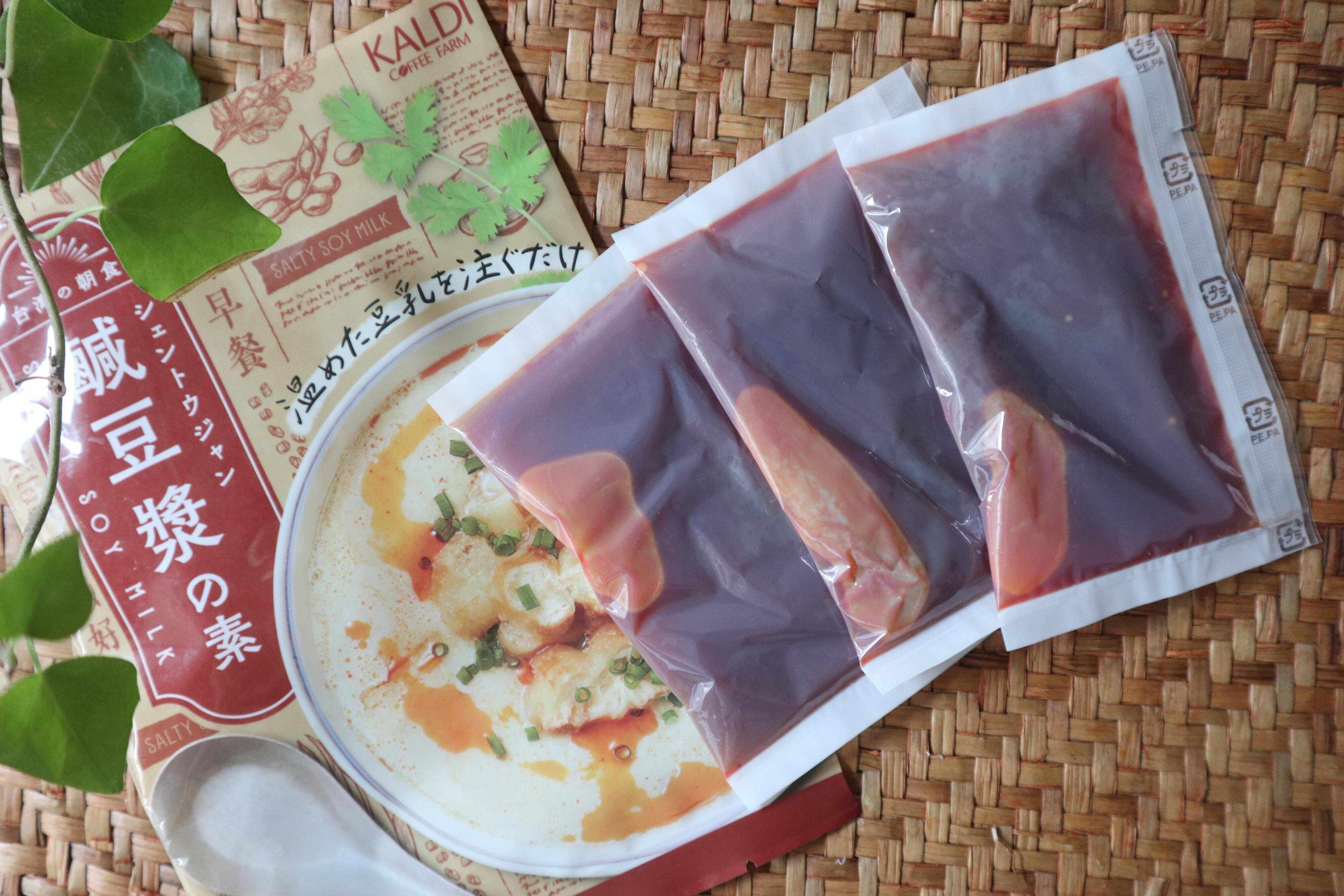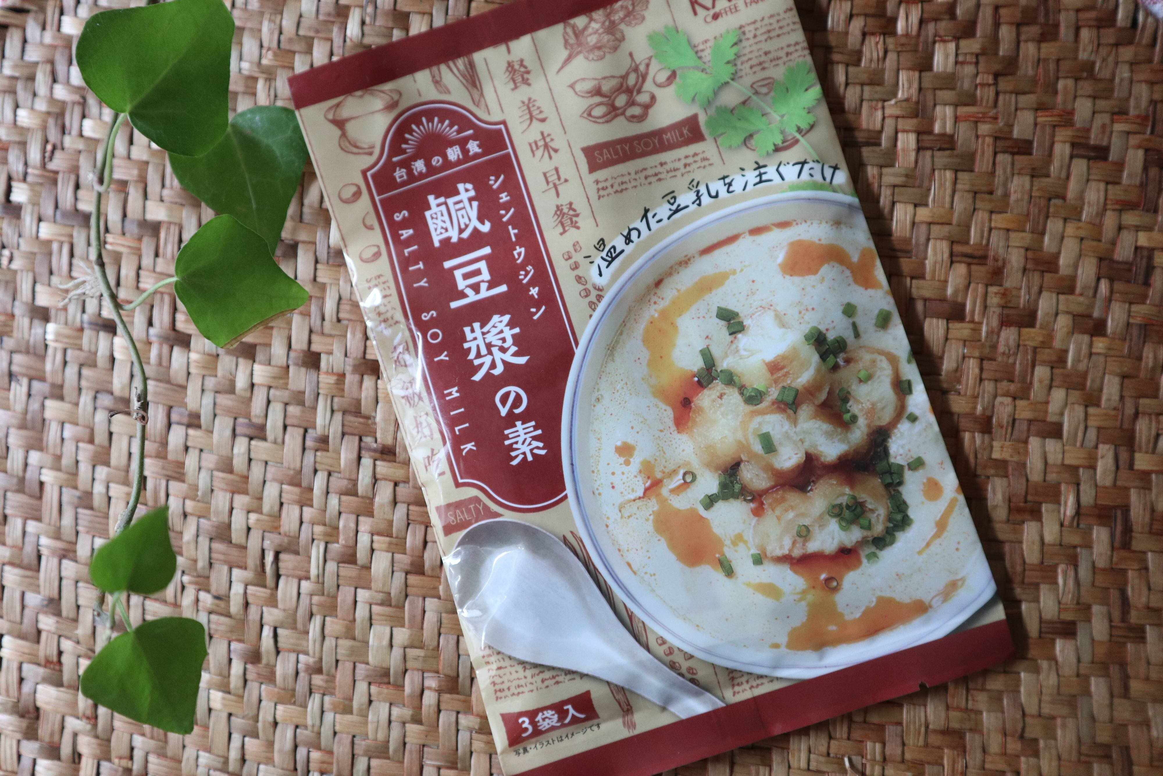 カルディの「シェントウジャンの素」。3袋入りで180円です。今、SNSでも話題で、専門店もできるほど人気!台湾で定番の朝ごはんです。ヘルシーでおいしく女性にうれしい朝食です。