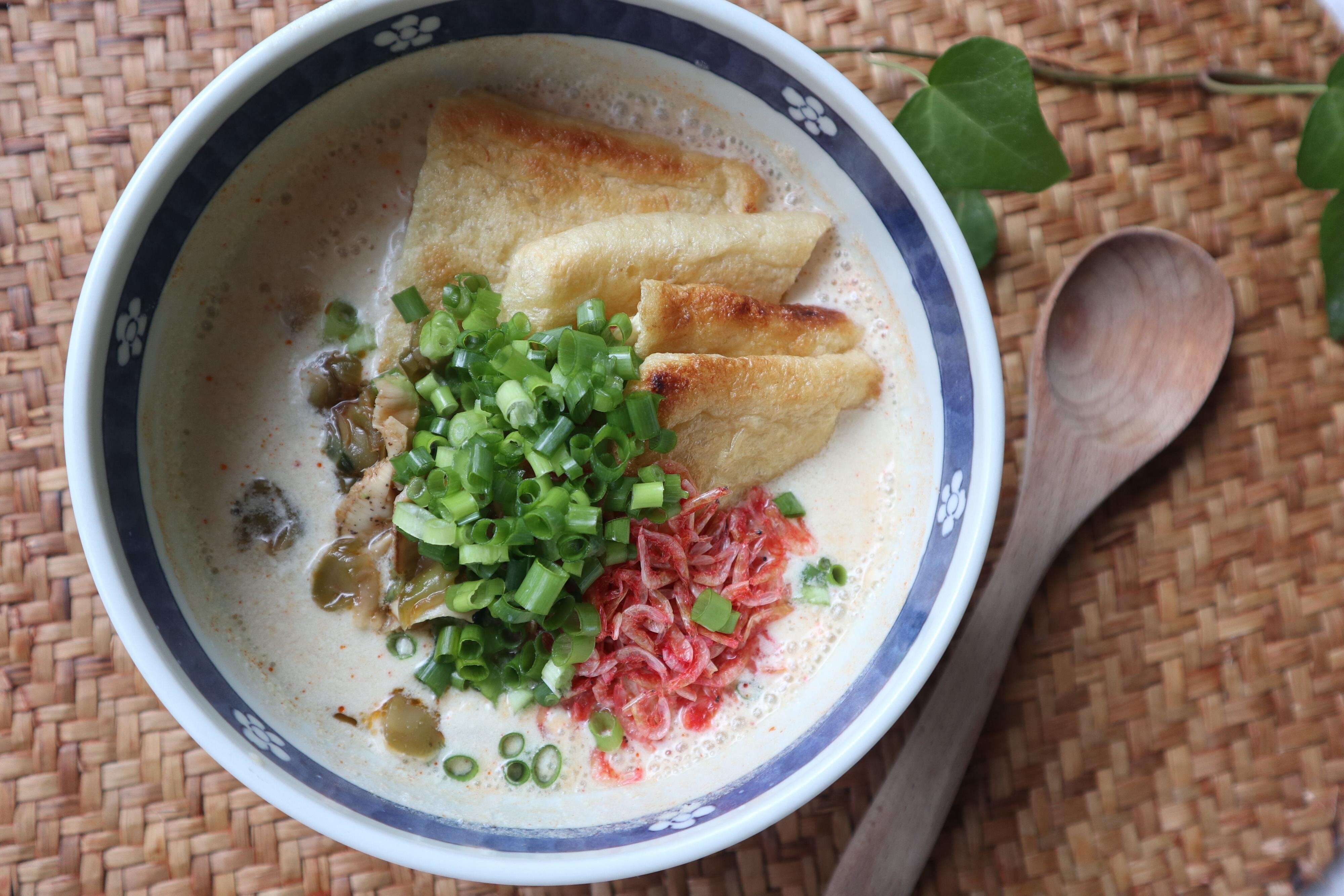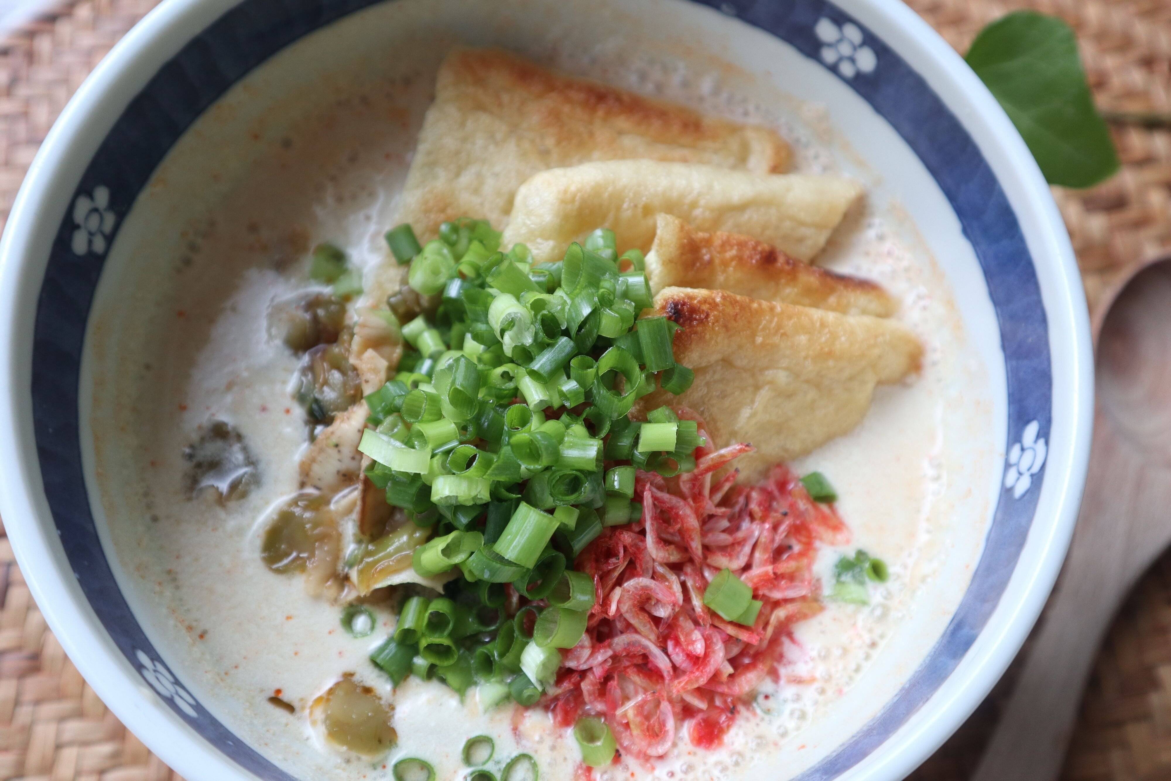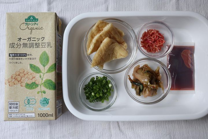 具材を用意します。無調整豆乳、小ねぎ、桜エビ、搾菜、油揚げを用意しました。無調整豆乳はマストですが、そのほかの具材はお好みで用意してください。