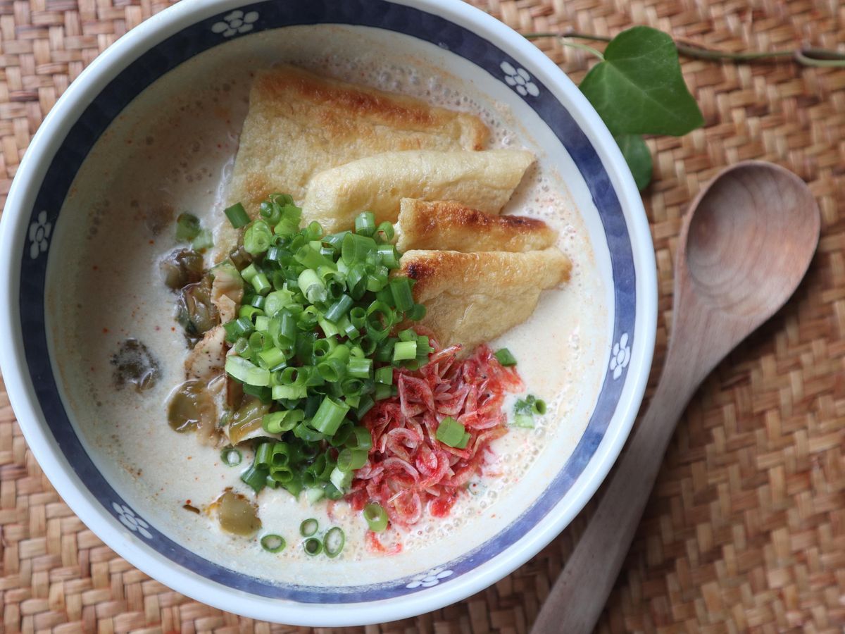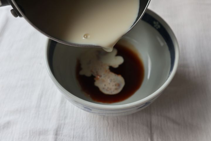 器にタレを入れて、沸騰手前まで温めた豆乳を加えて混ぜます。とろみがついてきたら具材をトッピング。
