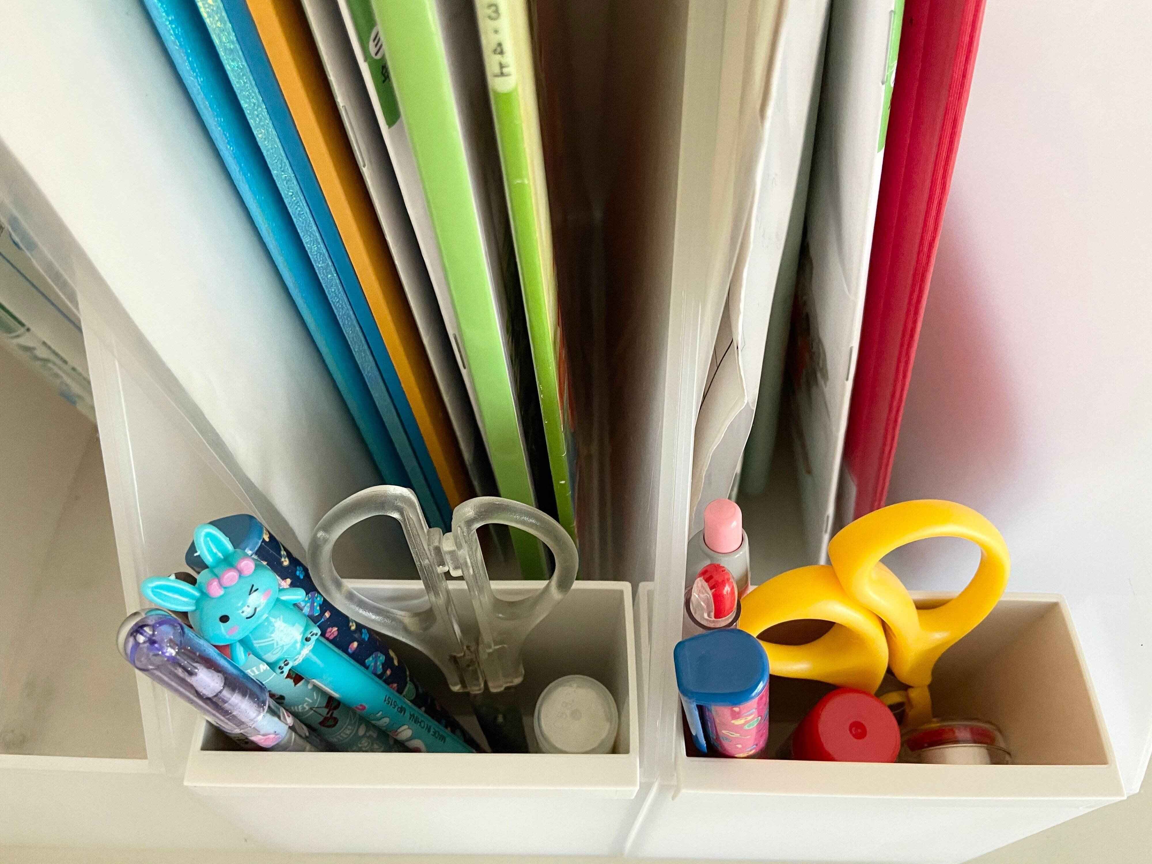 わが家の小学3年生の双子の教科書類の収納に1人1つずつPPスタンドファイルボックスを使っています。そこにファイル用のポケットを引っかけて鉛筆、ペン、ハサミなどを収納しています。
