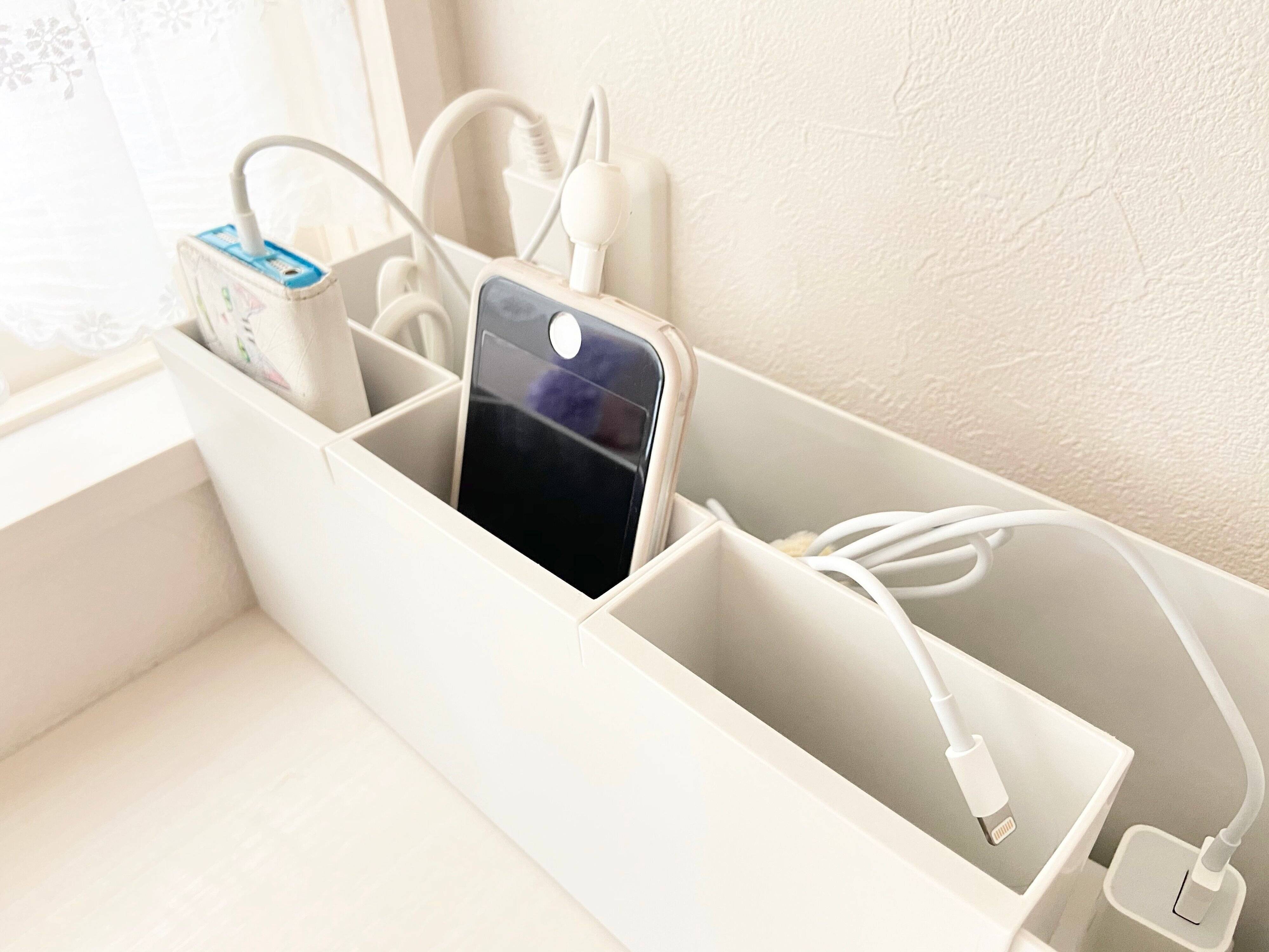 携帯の充電場所をスッキリさせたくて最近取り入れたのが、PPファイルボックス・スタンダードタイプ・1/2とポケット。ポケット3つをファイルボックスに引っかけて携帯3つの充電ステーションにしています。携帯がすっぽり収まってスッキリ見えるのでとってもお気に入りです。