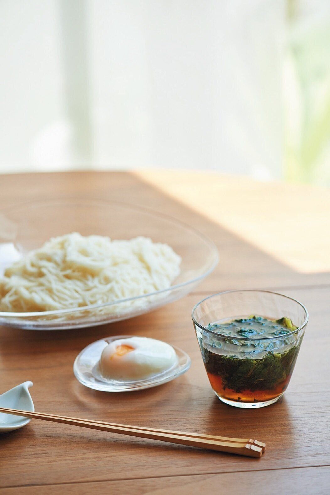 そうめんだけだと栄養不足に。そこで、冷凍モロヘイヤを使う分だけ折ってつゆにIN!手軽に食物繊維やビタミンが補えます。さらに温泉卵を添えれば、たんぱく質もカバー。
