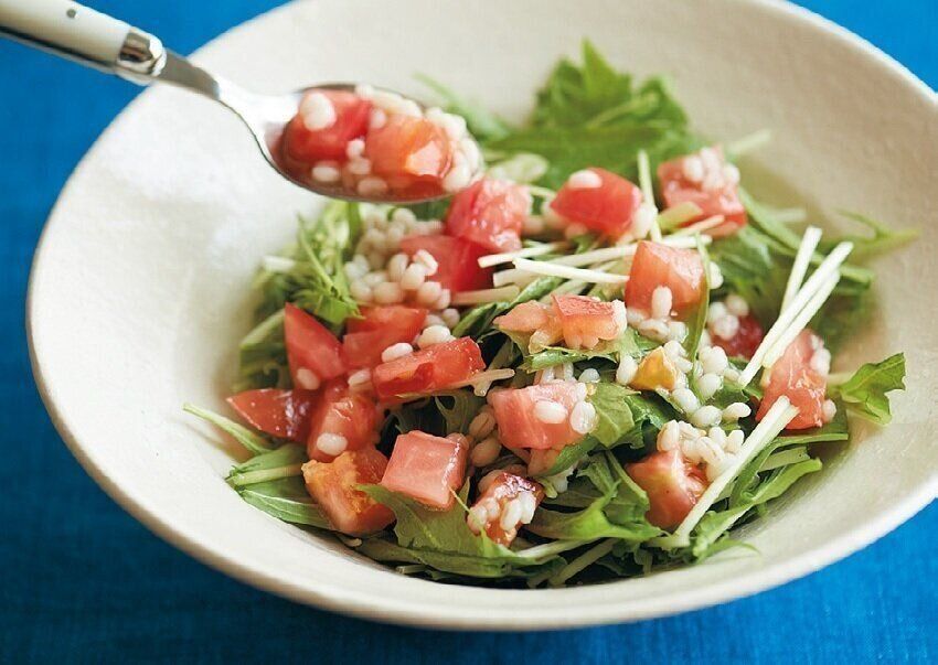 ゆでもち麦にさいの目切りのトマト、フレンチドレッシングを混ぜ合わせ、サラダにトッピング。食物繊維を補い、歯応えもUP!