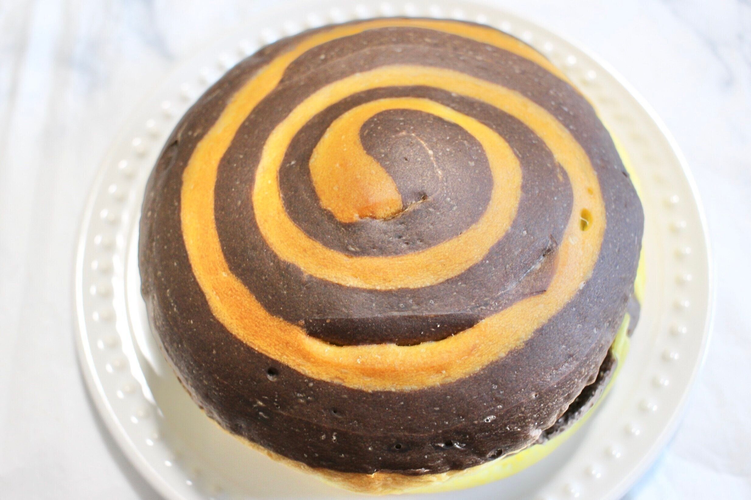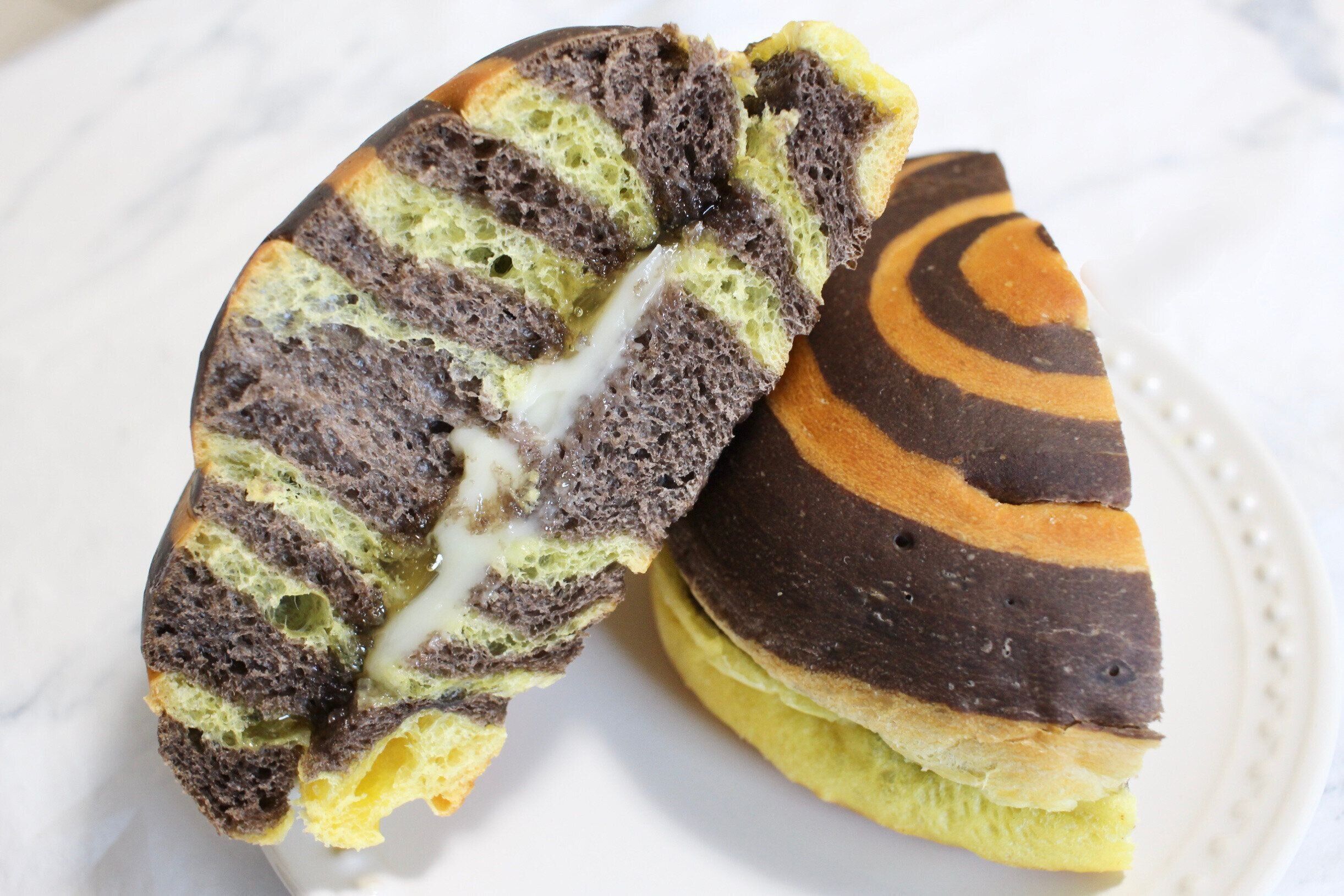 2色の生地を重ねてうずまき状に巻いたパンに、アカシアはちみつ入りのフィリングとミルククリームを挟んでいます。