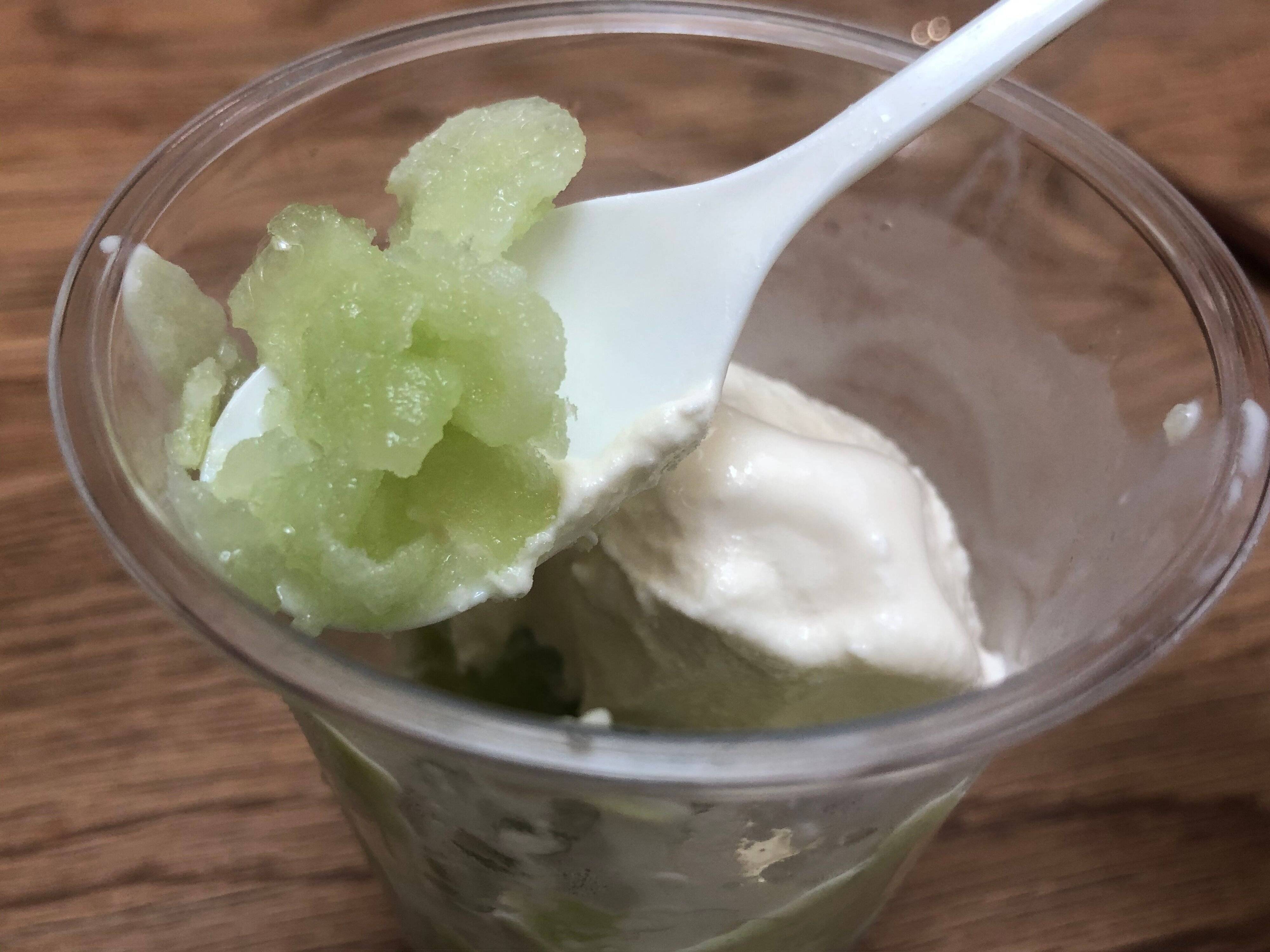 下層にはマイナス30度で急速冷凍されたフローズメロンがぎっしり!メロンの甘さとあの特有の青臭さ(いい意味で)、シャリシャリとした食感で美味しい。