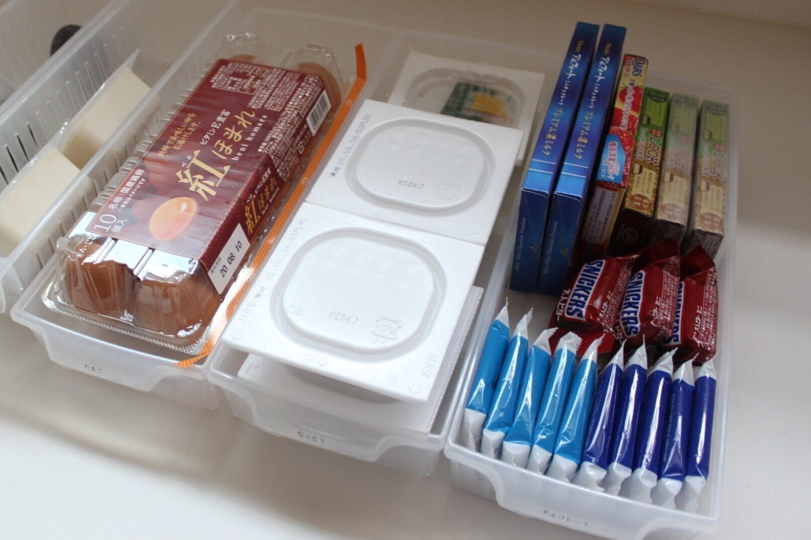 ▽卵のストックと納豆、お菓子スペース
