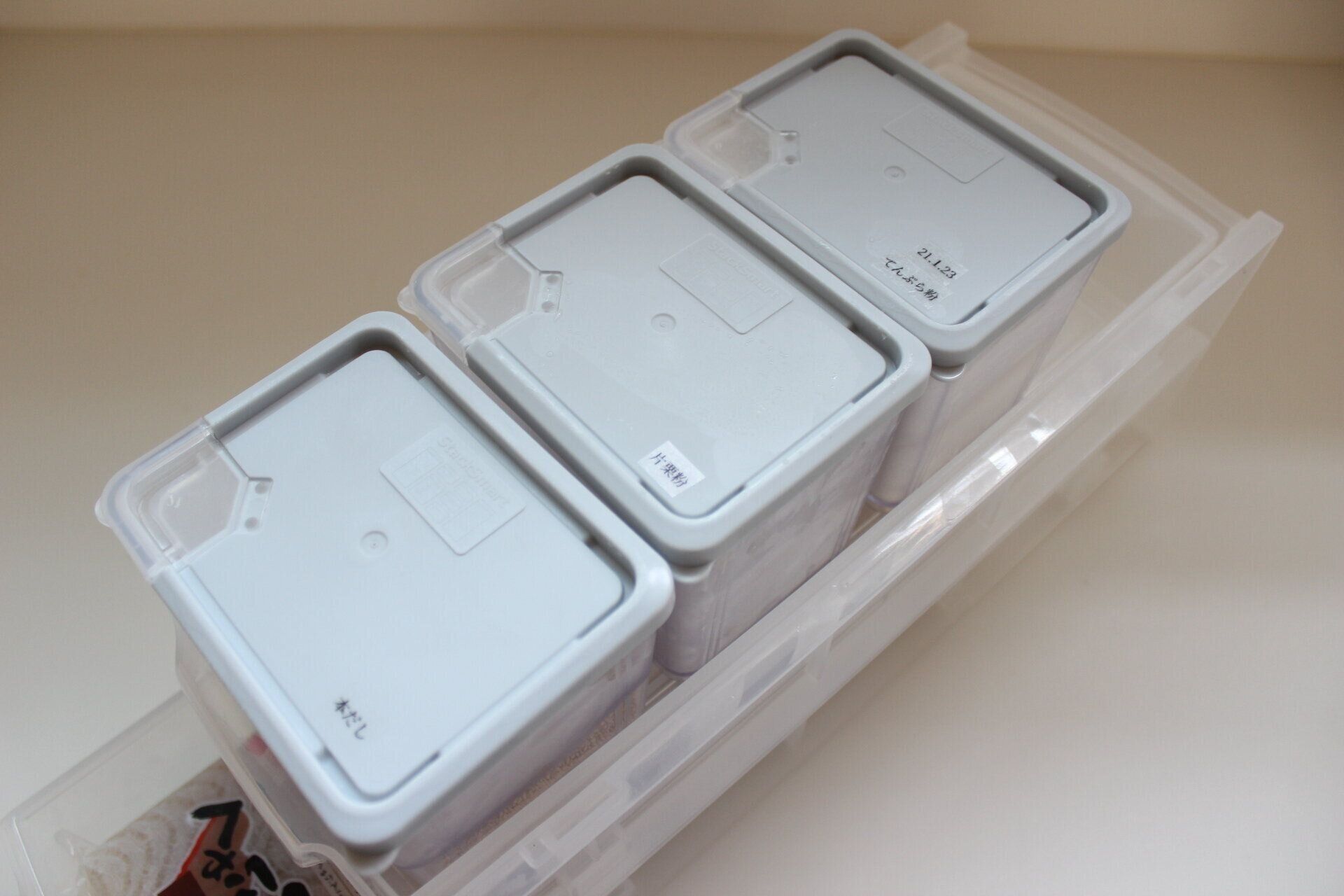 片栗粉・天ぷら粉・本だしはダイソーのオープンキャップ保存容器に収納。