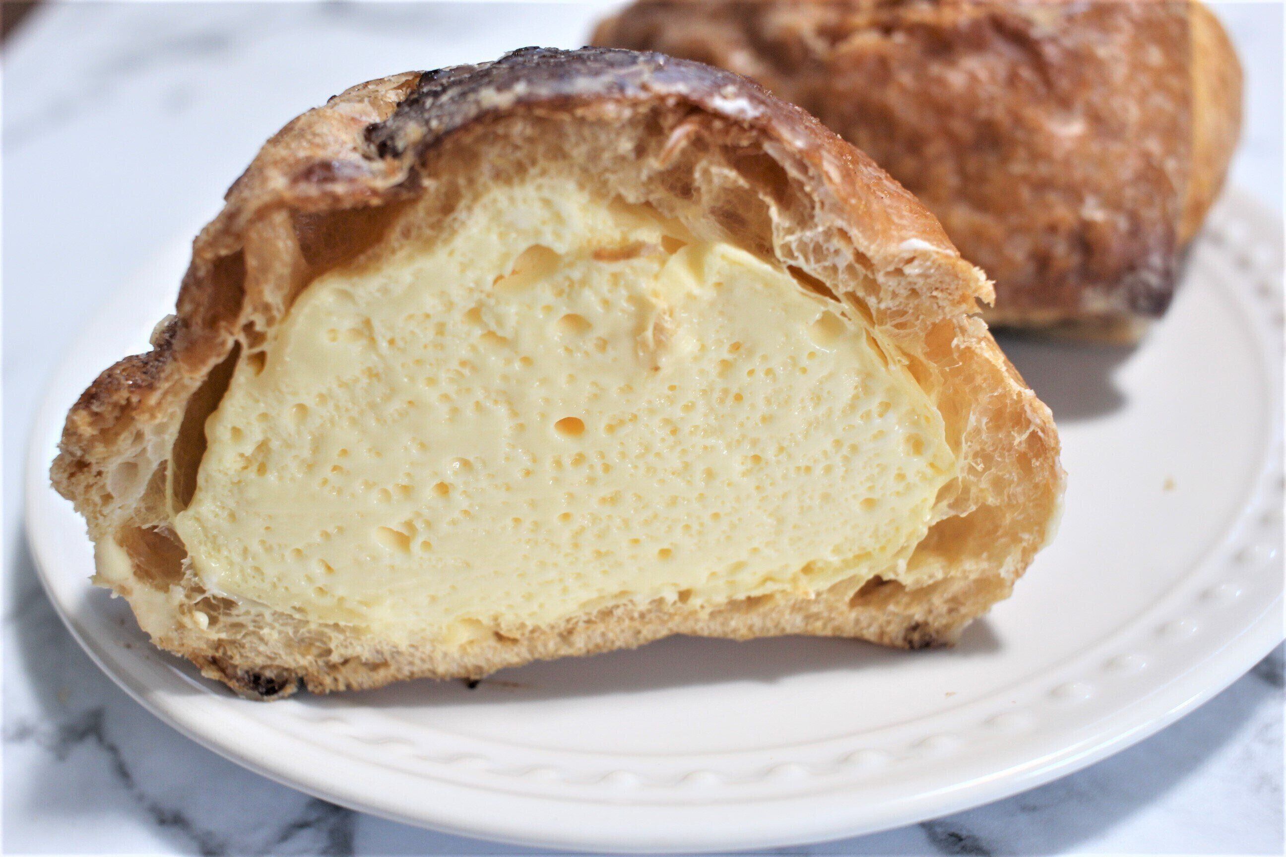 砂糖を焦がしたかのように焼き上げたパイシートがのったシュー生地に、生クリームと牛乳、卵黄の風味豊かなとろ~り食感のプリンクリームがたっぷりと入っているそう!
